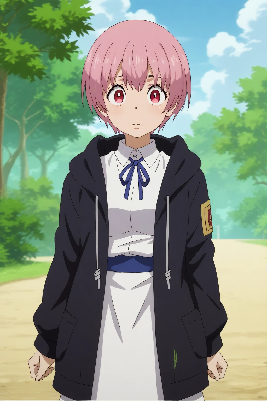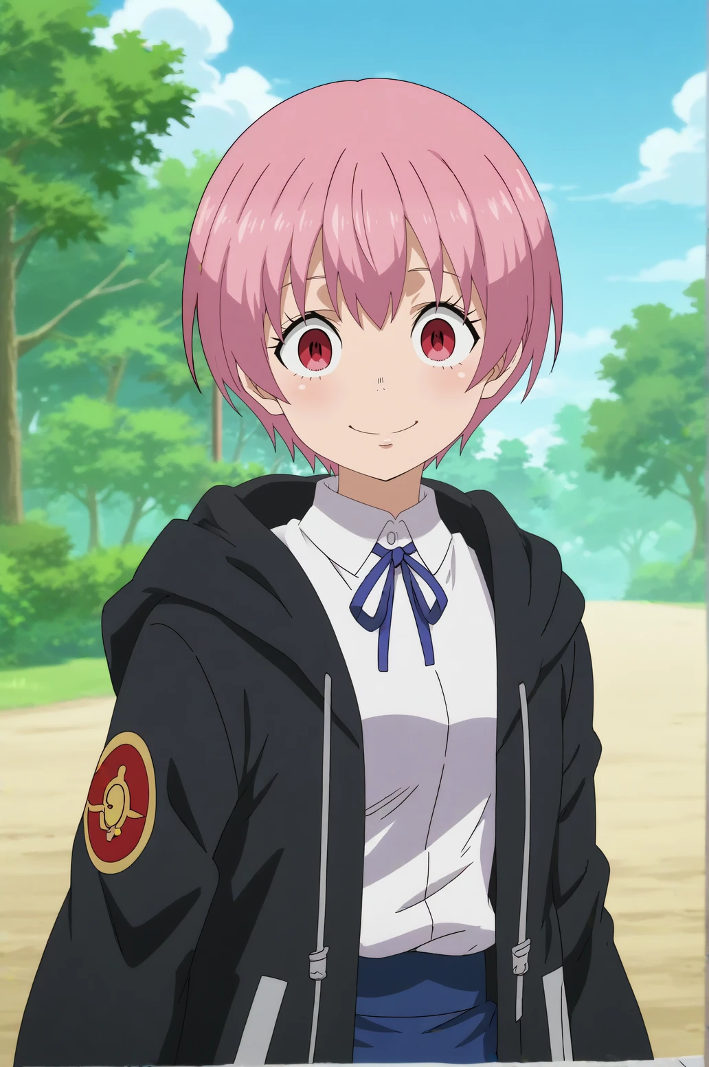 Triggers : inca kasugatani,short hair,ribbon,smile, white blouse, black hoodie, open clothes