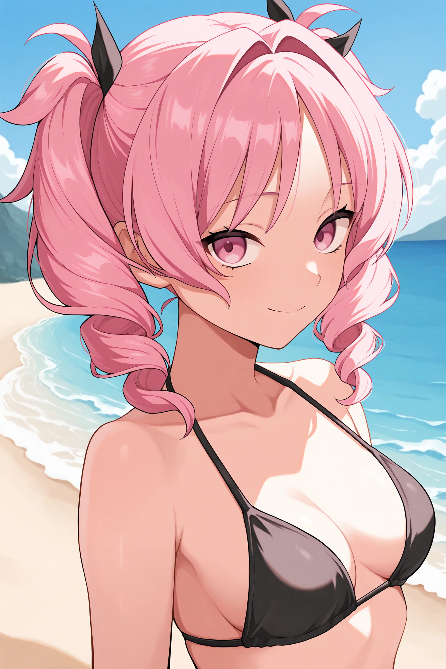 pink hair, hair intakes, hair black ribbons, twin drills, parted bangs, drill hair, medium hair, pink eyes