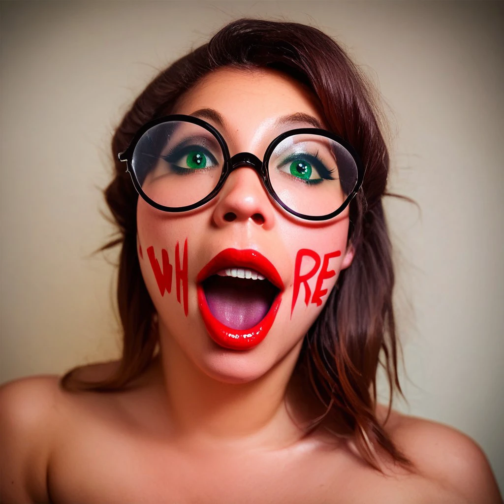 Generates pictures featuring bodywriting. Has a focus on creating 'whorelipstick' face writing, defined as using the mouth for part of a word (usually the 'O' in 'whore' or 'toy' in the training set.)