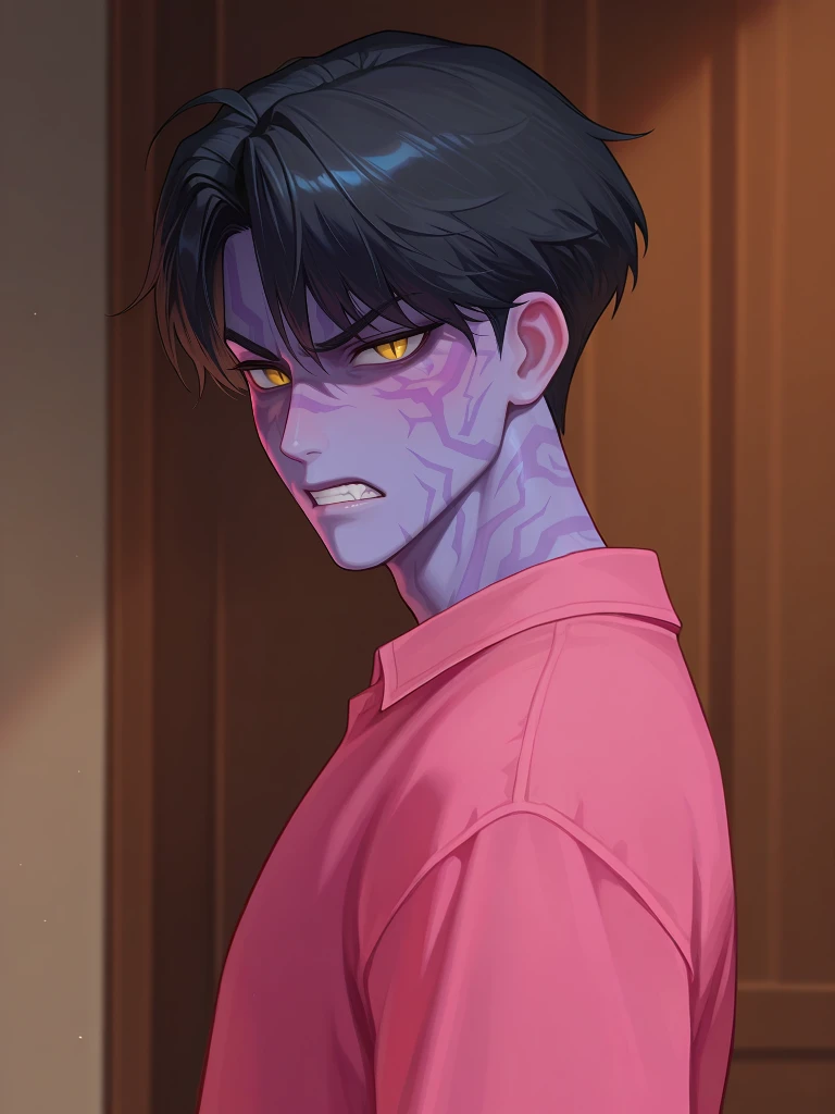 Demon form: black hair, demonic markings, purple skin, yellow eyes, slit pupils
