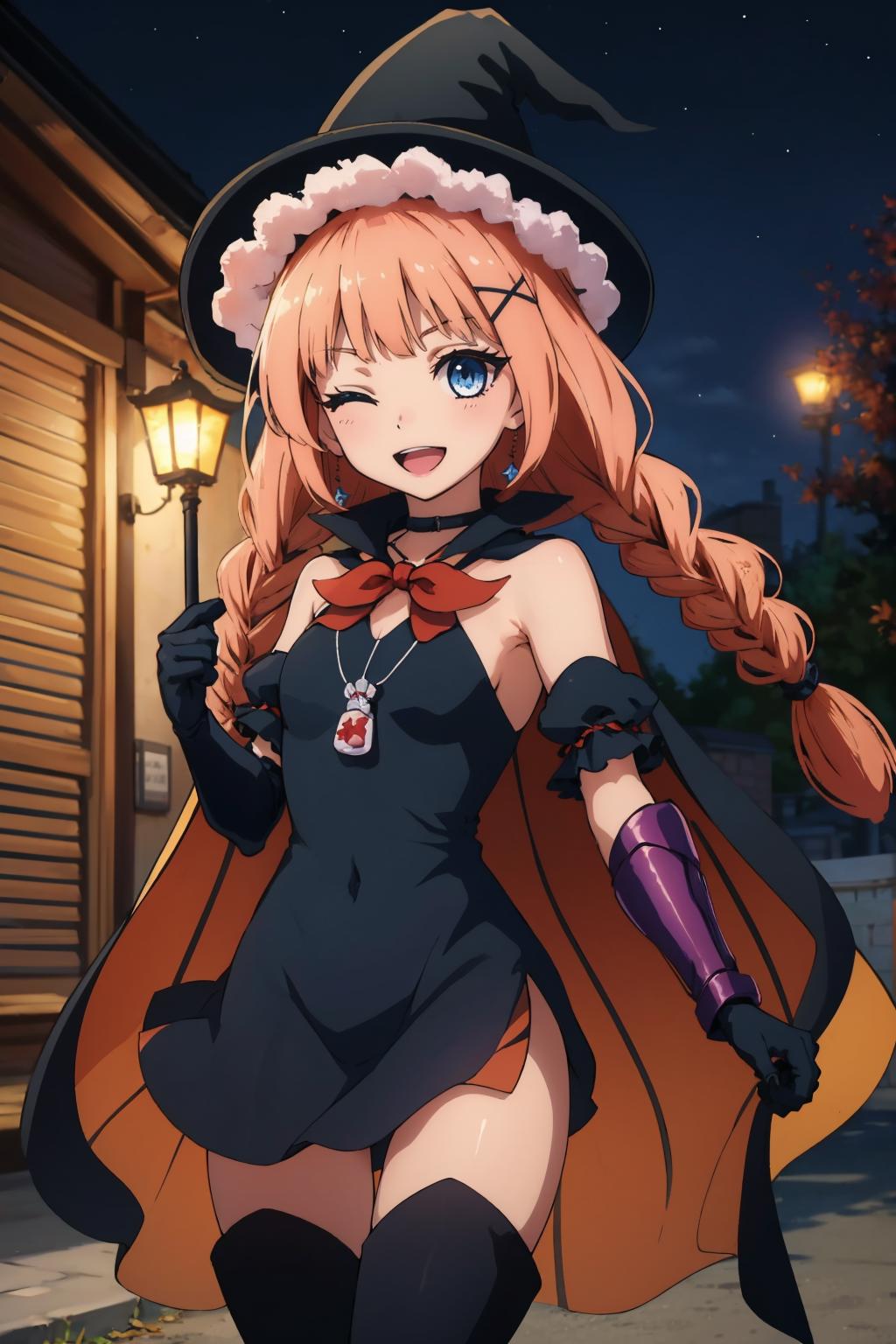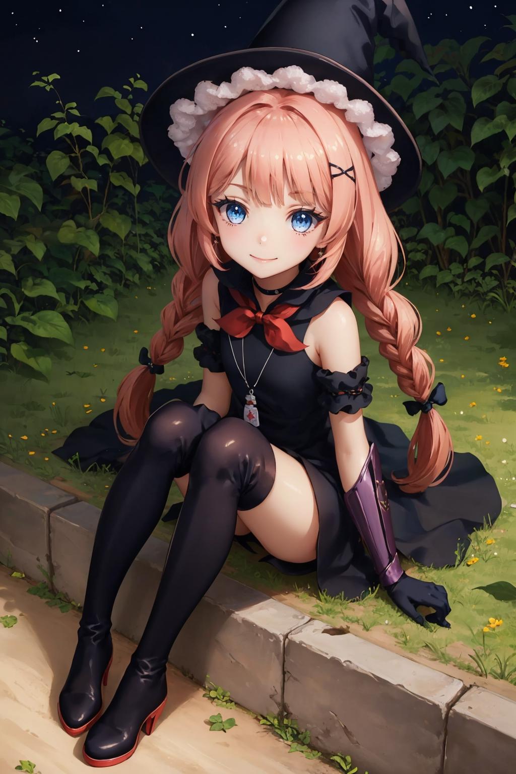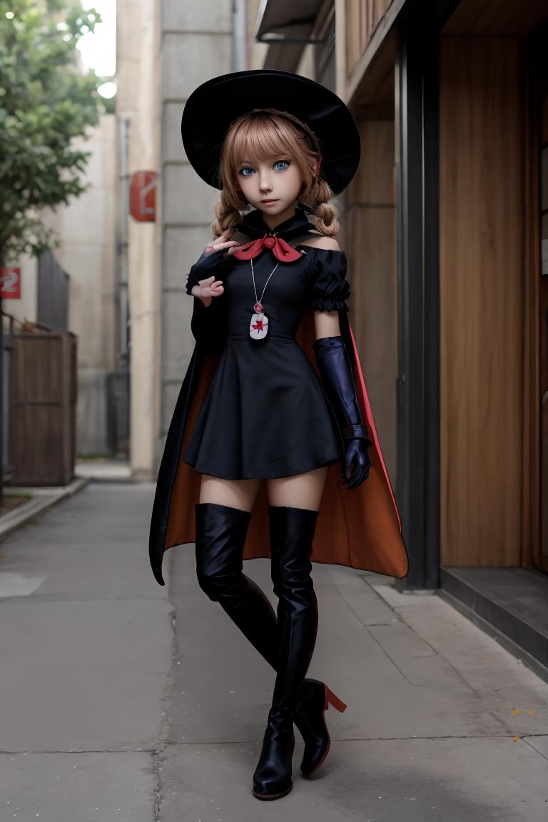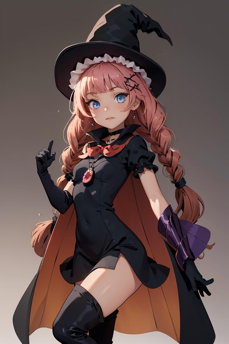 Add "twin braids, witch hat, necklace, black dress, black cape, bow, elbow gloves, thigh boots" for her typical look.