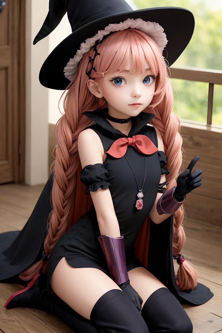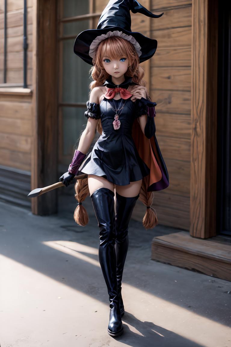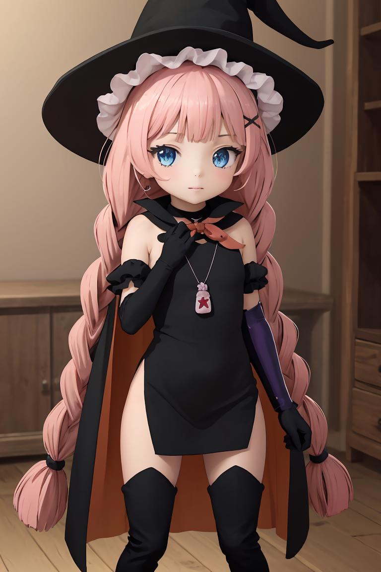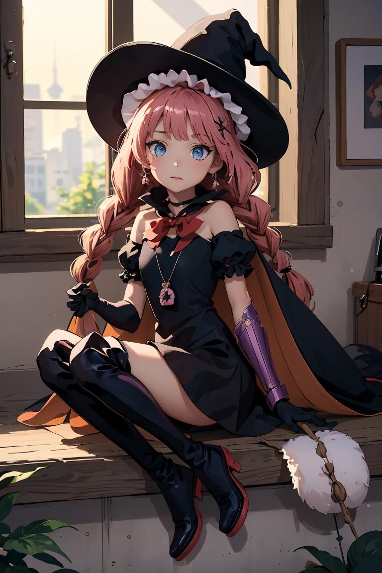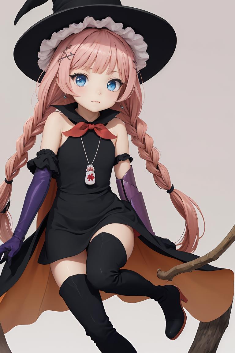 Add "twin braids, witch hat, necklace, black dress, black cape, bow, elbow gloves, thigh boots" for her typical look.
