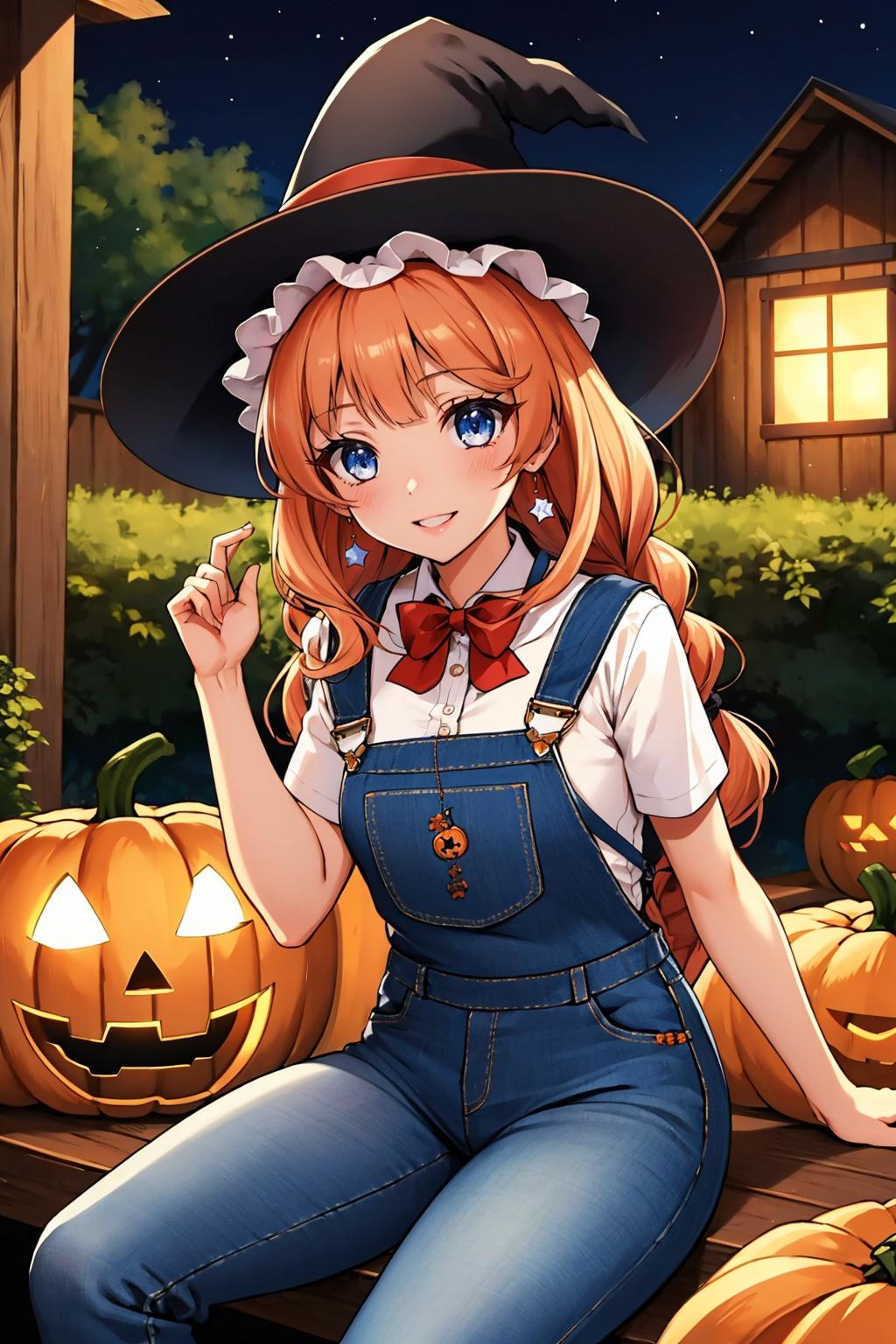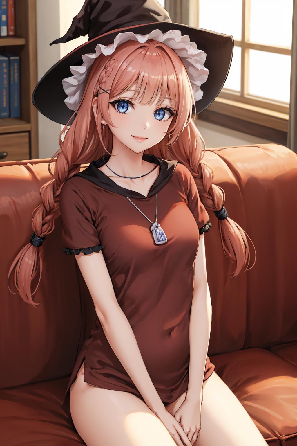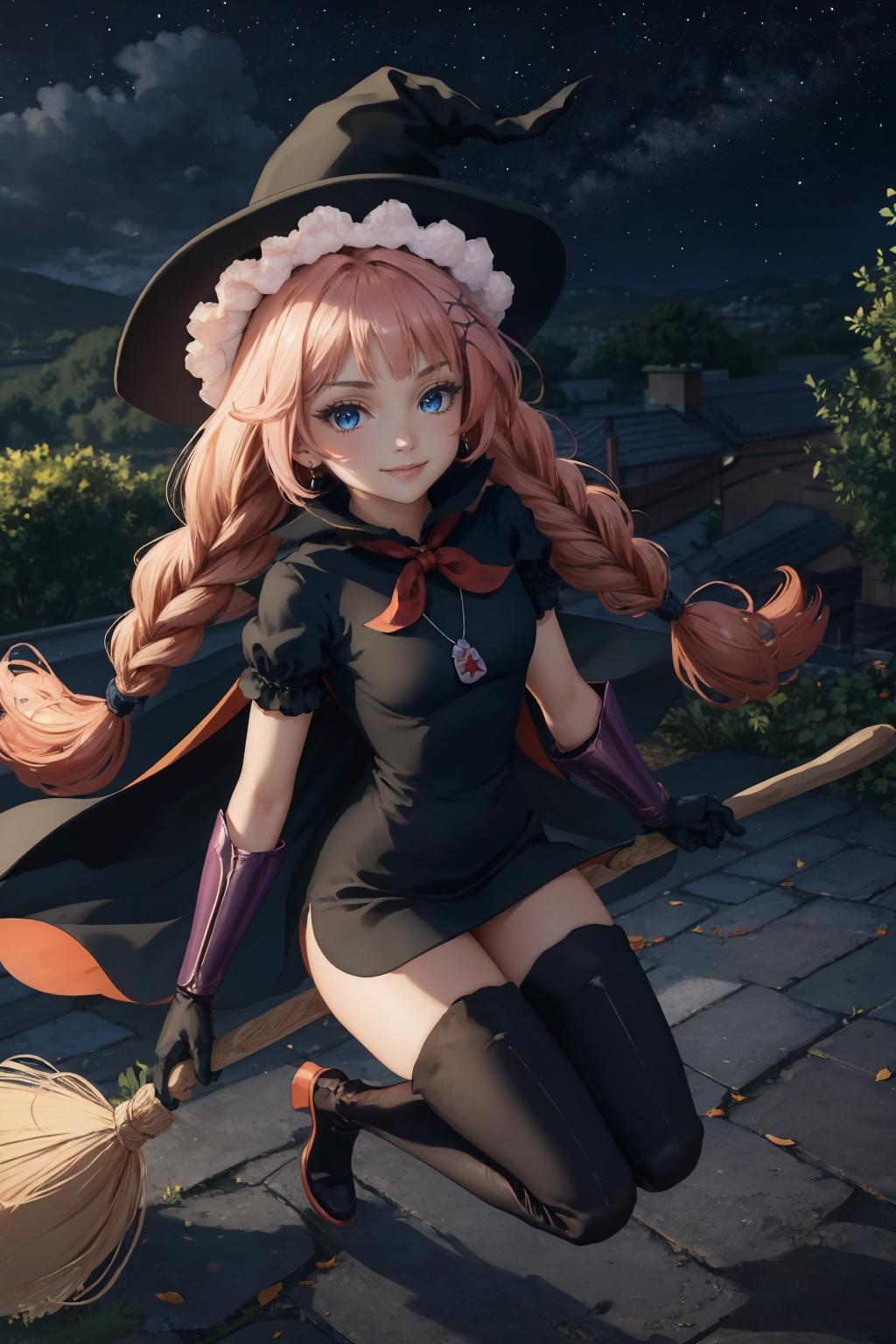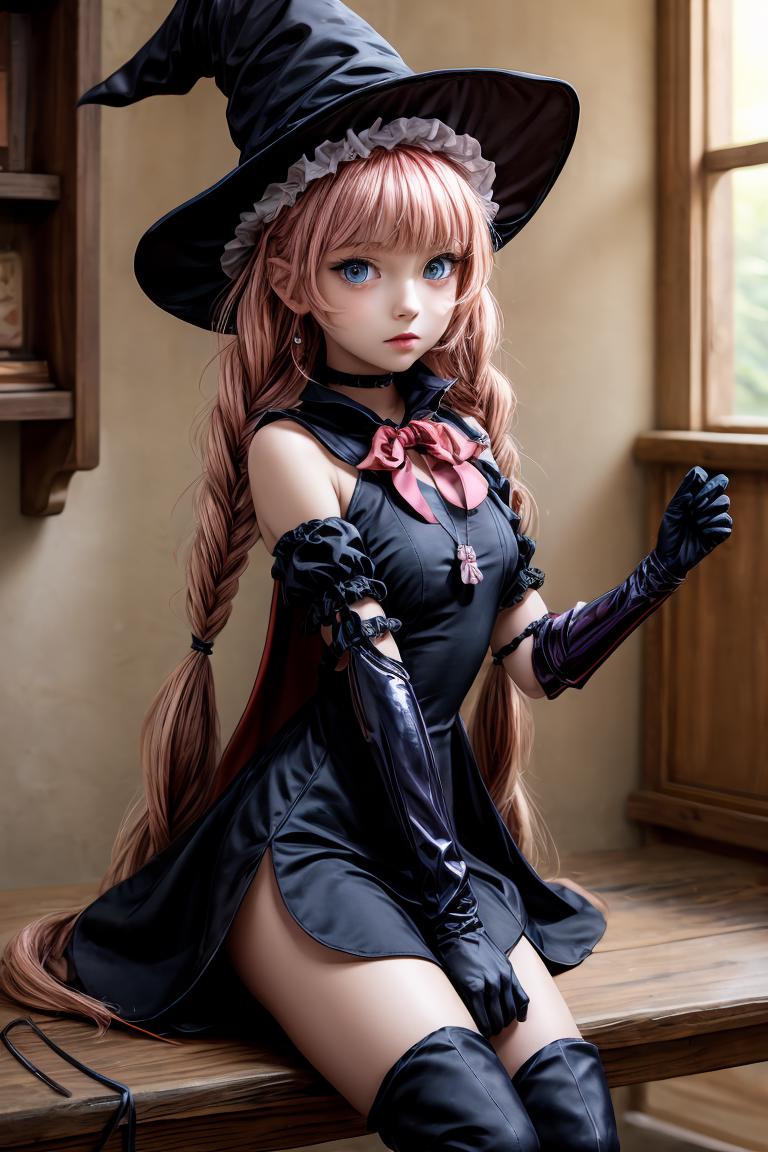 Add "twin braids, witch hat, necklace, black dress, black cape, bow, elbow gloves, thigh boots" for her typical look.