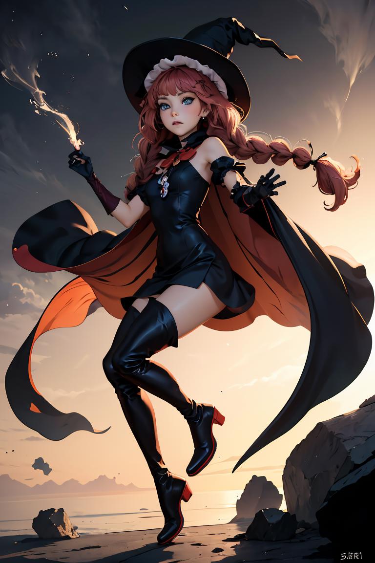 twin braids, witch hat, necklace, black dress, black cape, bow, elbow gloves, thigh boots