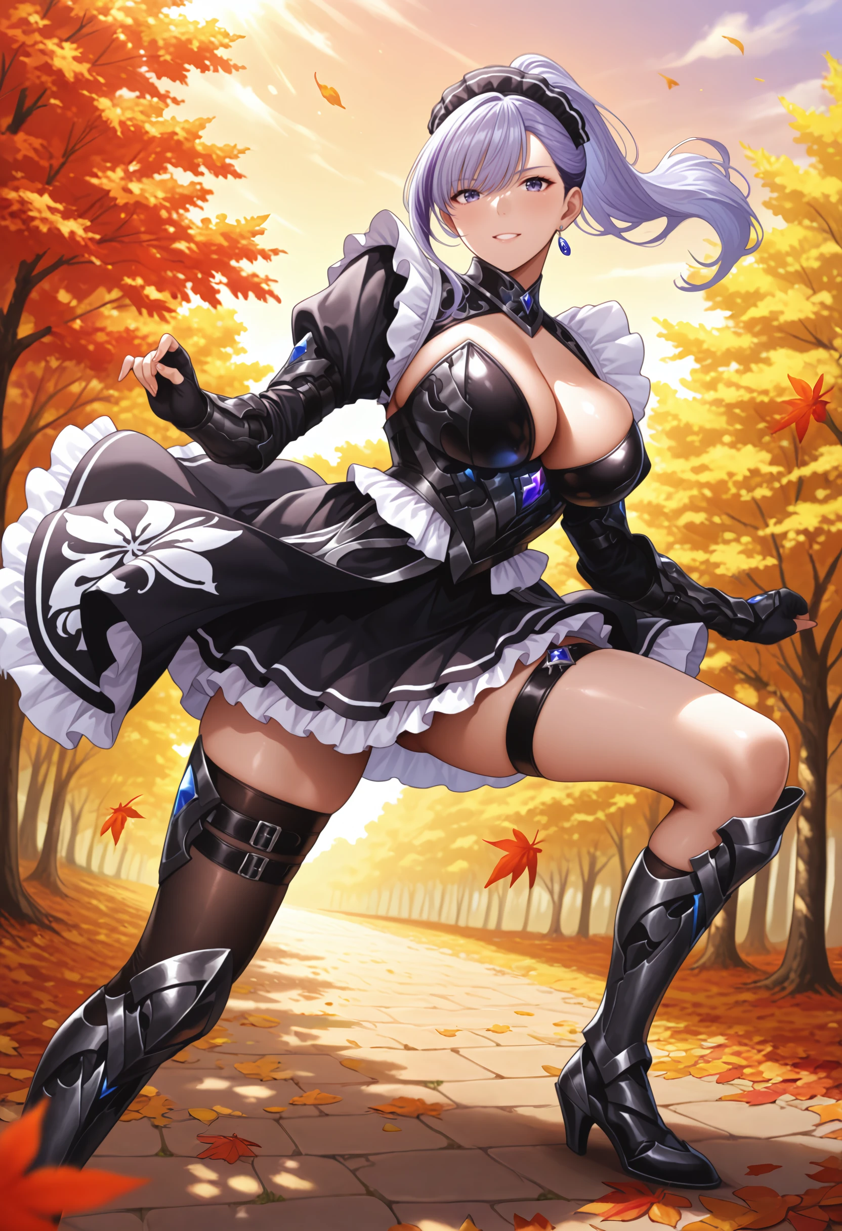 Default Outfit: DefSoltia, long sleeves, frills, armored boots, black skirt, frilled skirt, black gloves, puffy sleeves, black thighhighs, fingerless gloves, black dress, armor, maid, maid headdress, thigh strap, frilled dress, black footwear, gem, single thighhigh, asymmetrical legwear, long hair, ponytail, asymmetrical bangs, fingernails, silver trim, detailed clothing, floral print, gauntlets,