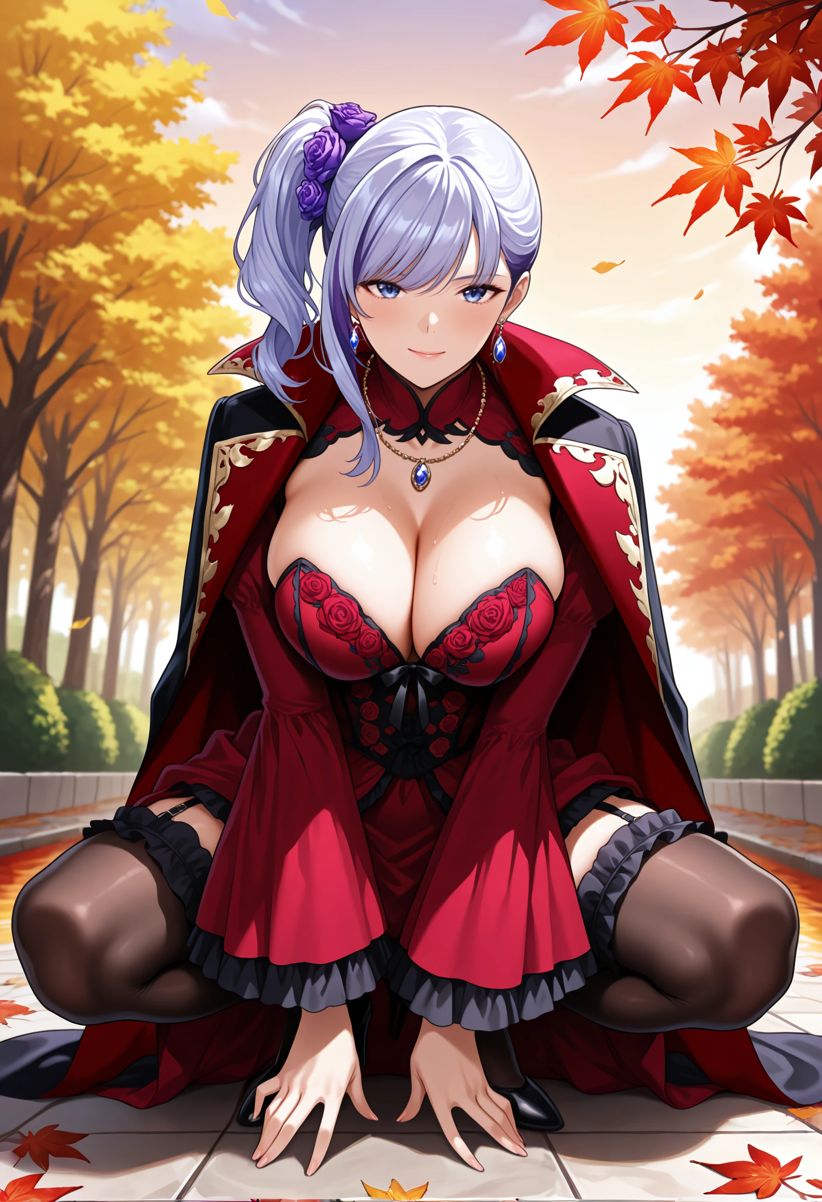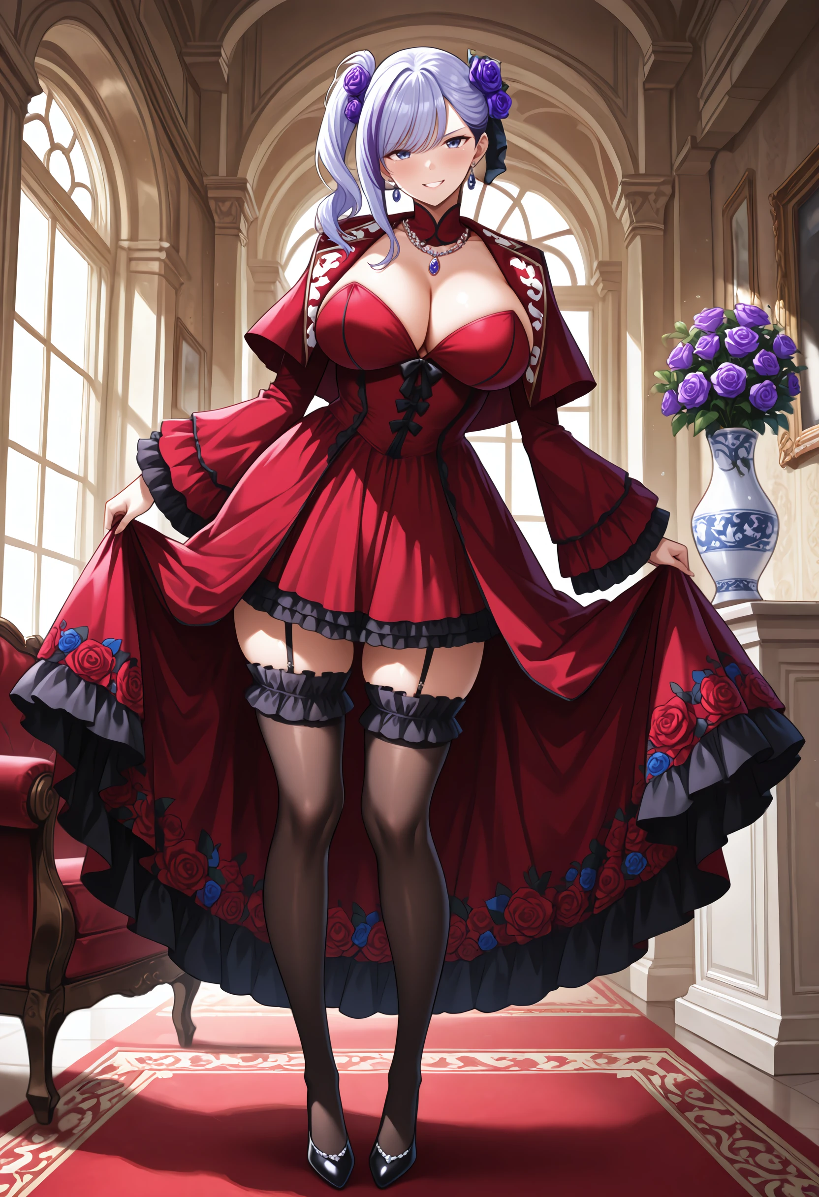 Seductive Vampire Outfit: SVSoltia, jewelry, earrings, frilled sleeves, black thighhighs, wide sleeves, high heels, detached collar, side ponytail, garter straps, red dress, gem, long sleeves, necklace, swept bangs, frilled dress, frilled thighhighs, purple rose, hair flower, detailed clothing, multicolored cape, streaked hair, floral print, official alternate costume, black bow,