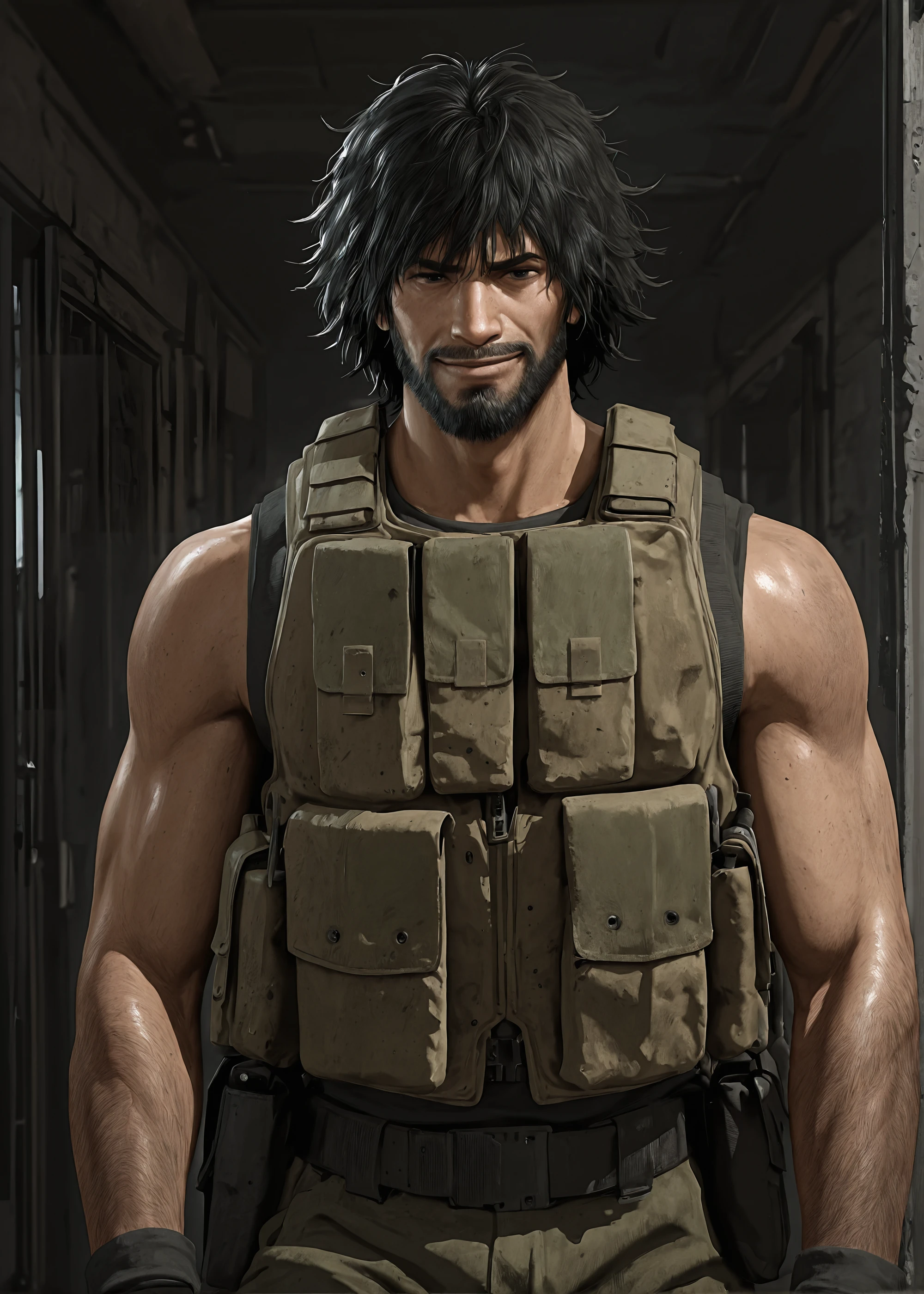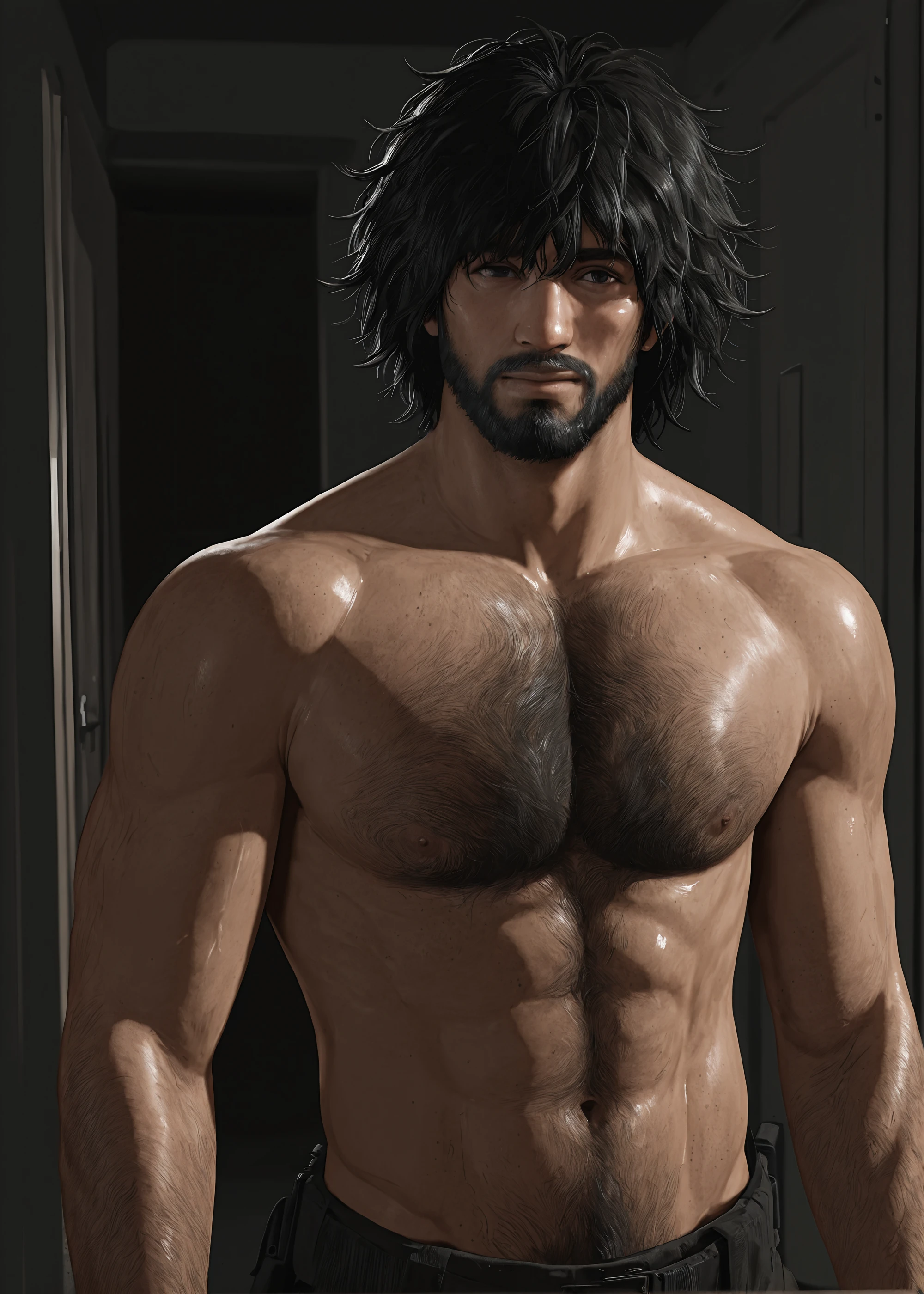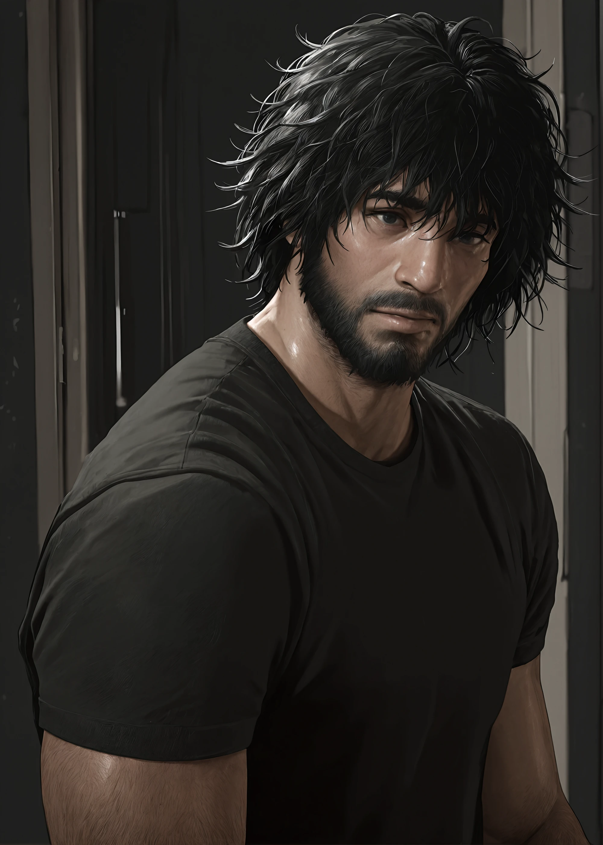 carlosoliveira, facial hair, realistic, black hair, beard,messy hair, perfect black eyes
