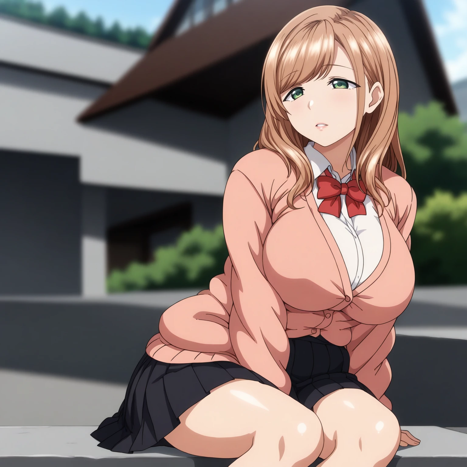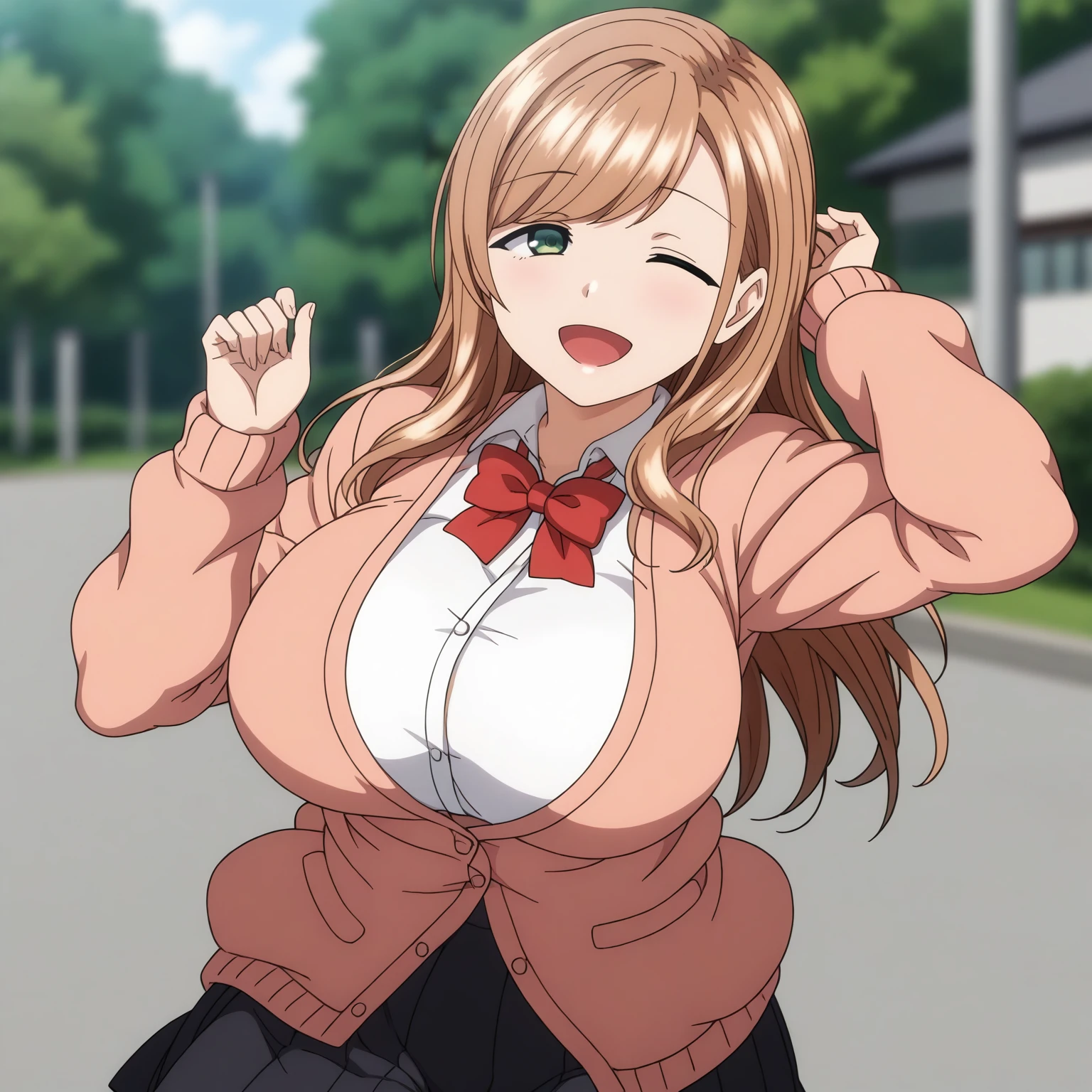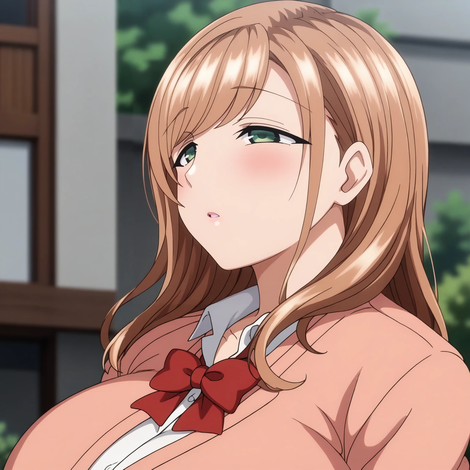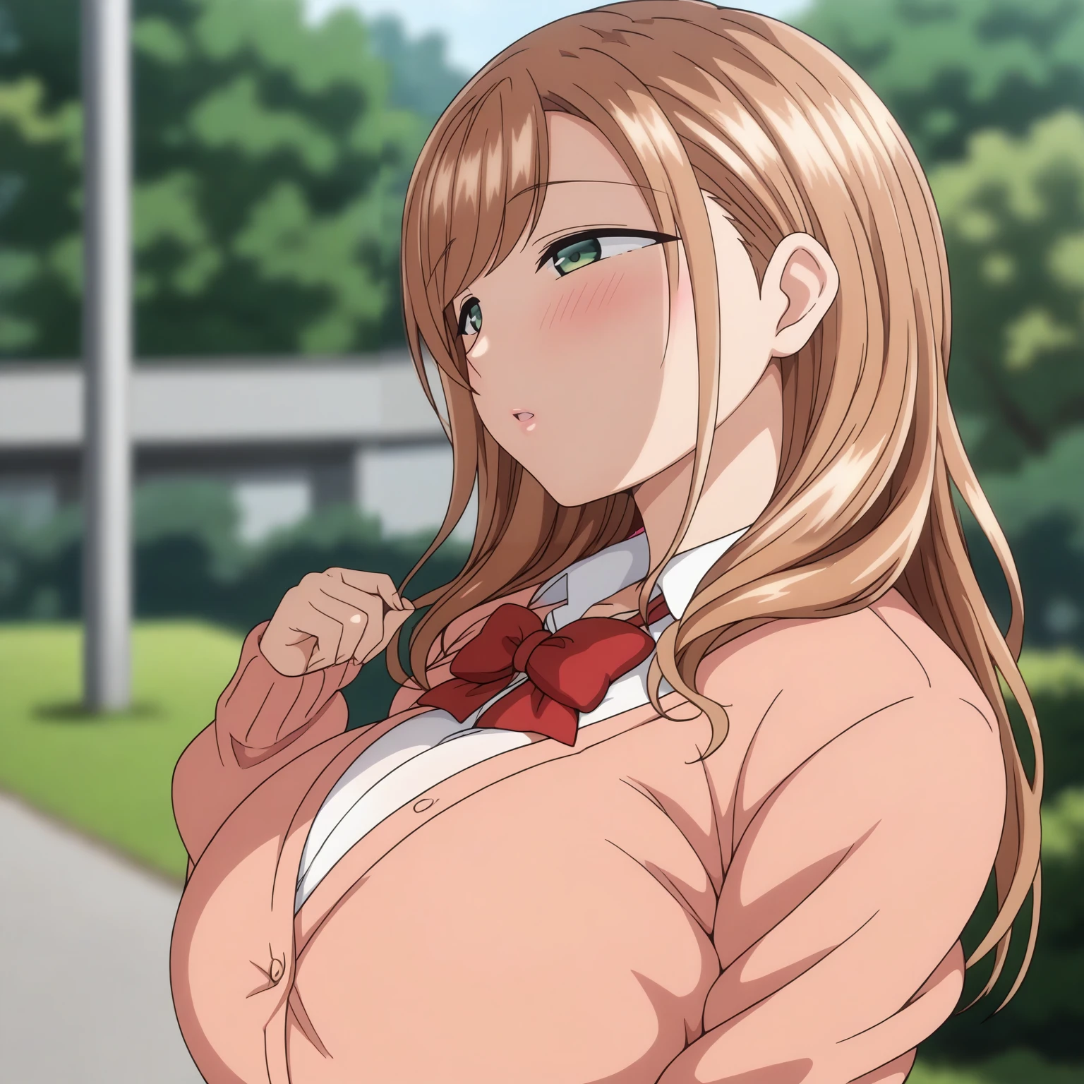 MinakoSanada,1girl,light brown hair,long hair,green eyes, large breasts,