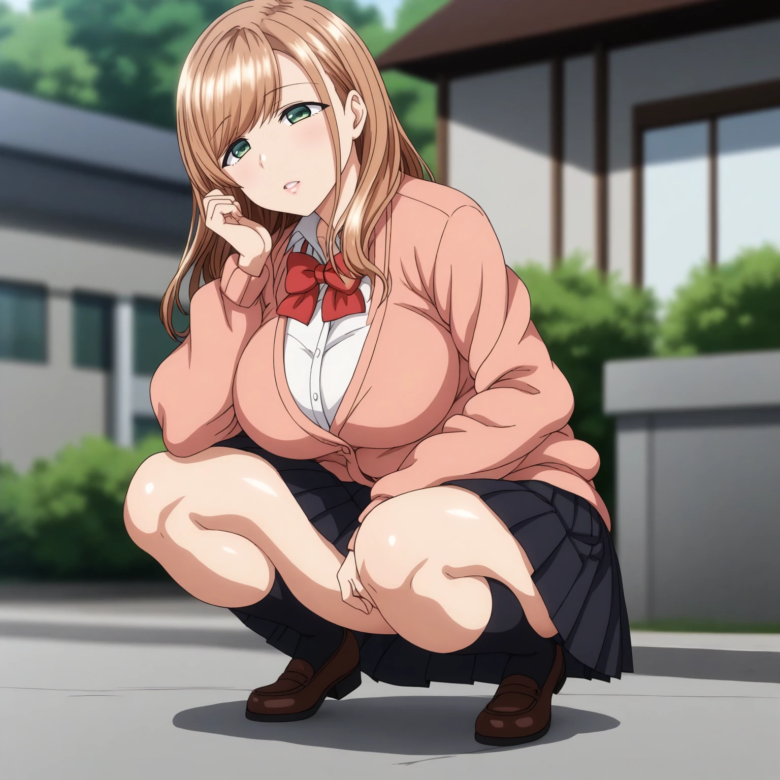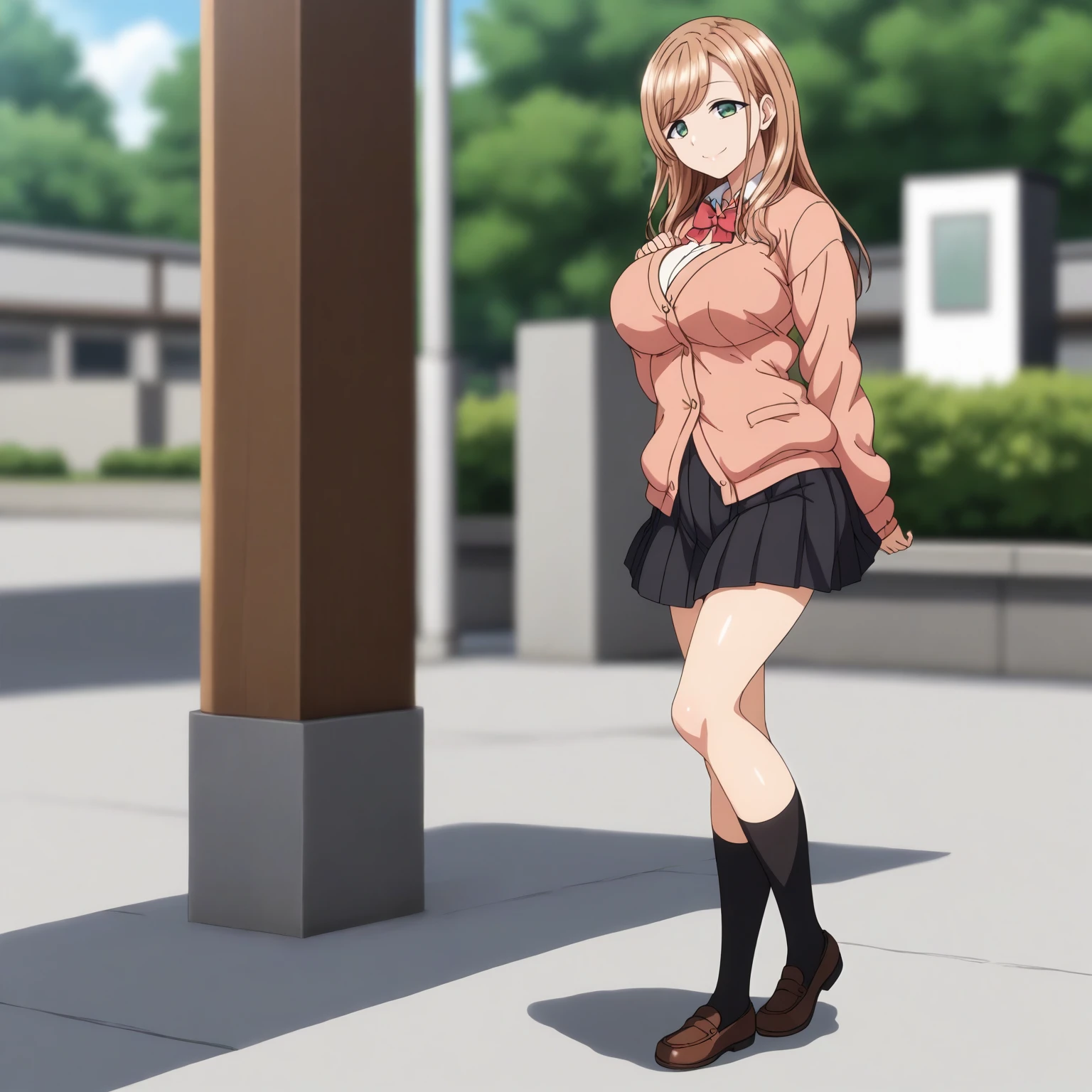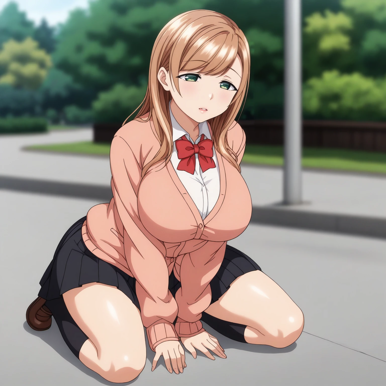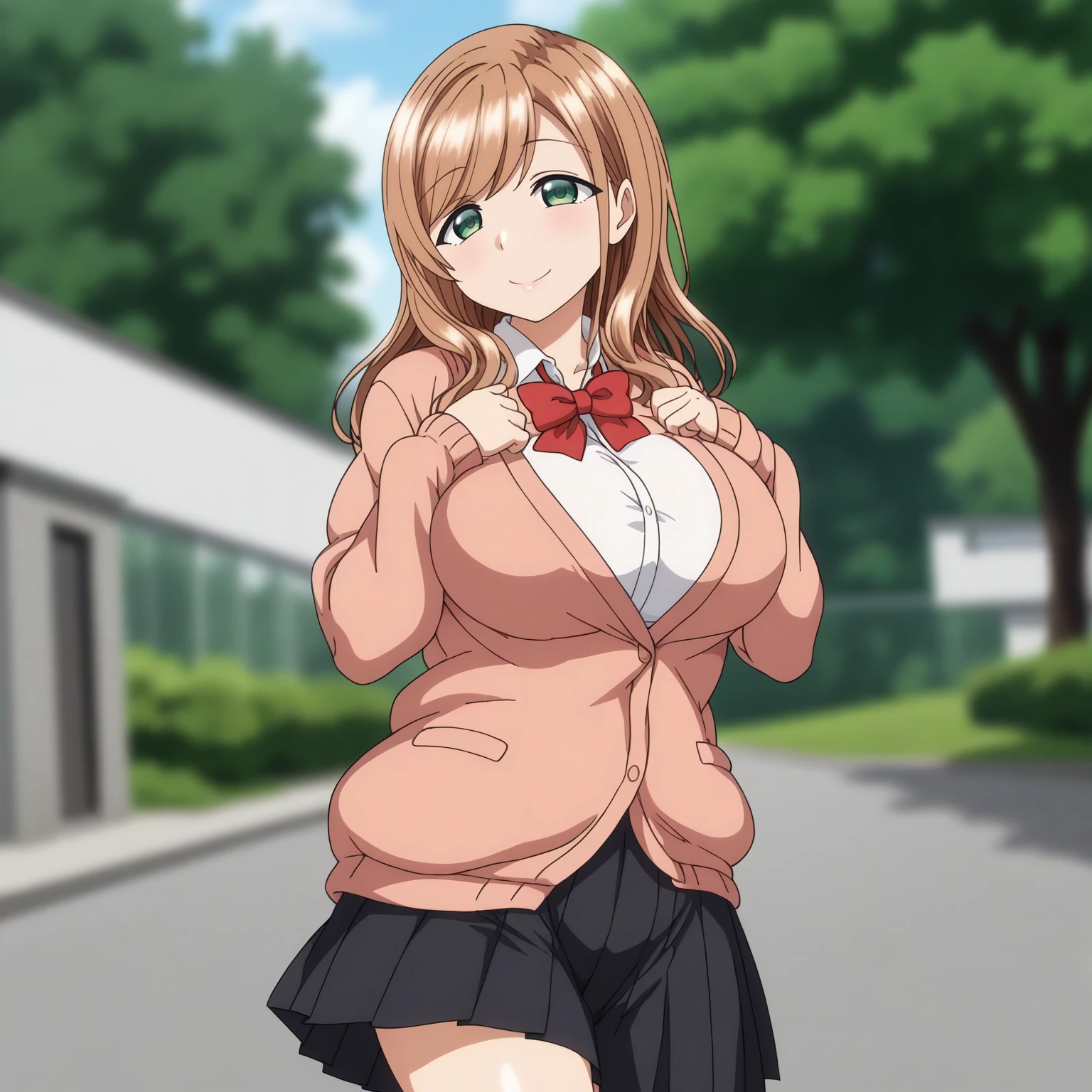 pink cardigan,white shirt,red bowtie, pleated_skirt,black skirt,