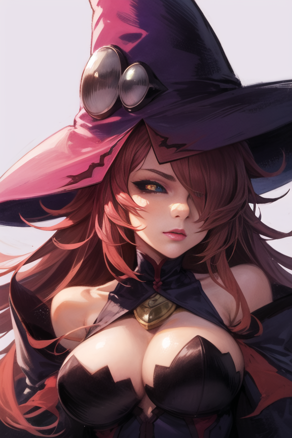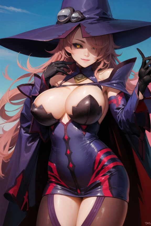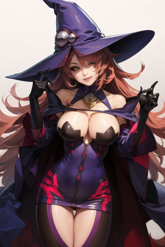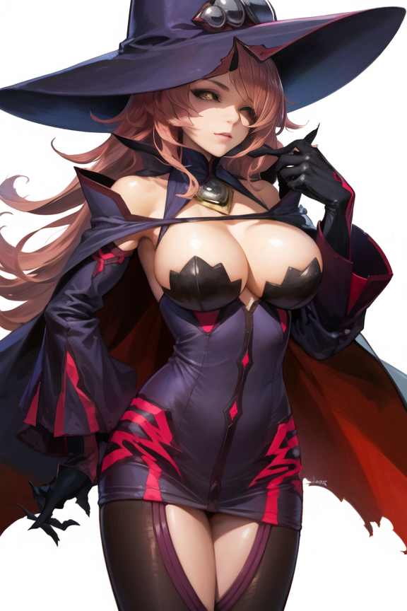 hat, witch hat, large breasts, gloves,cleavage,deteched sleeves, bare shoulders, cape, thighhighs, black legwear, witch, fire