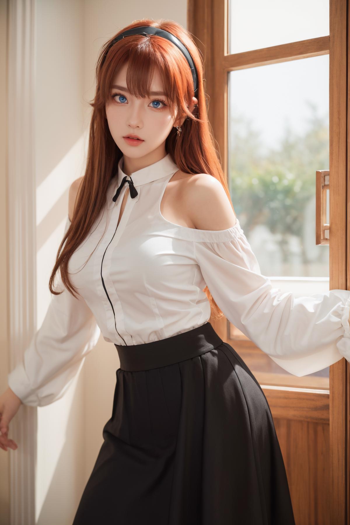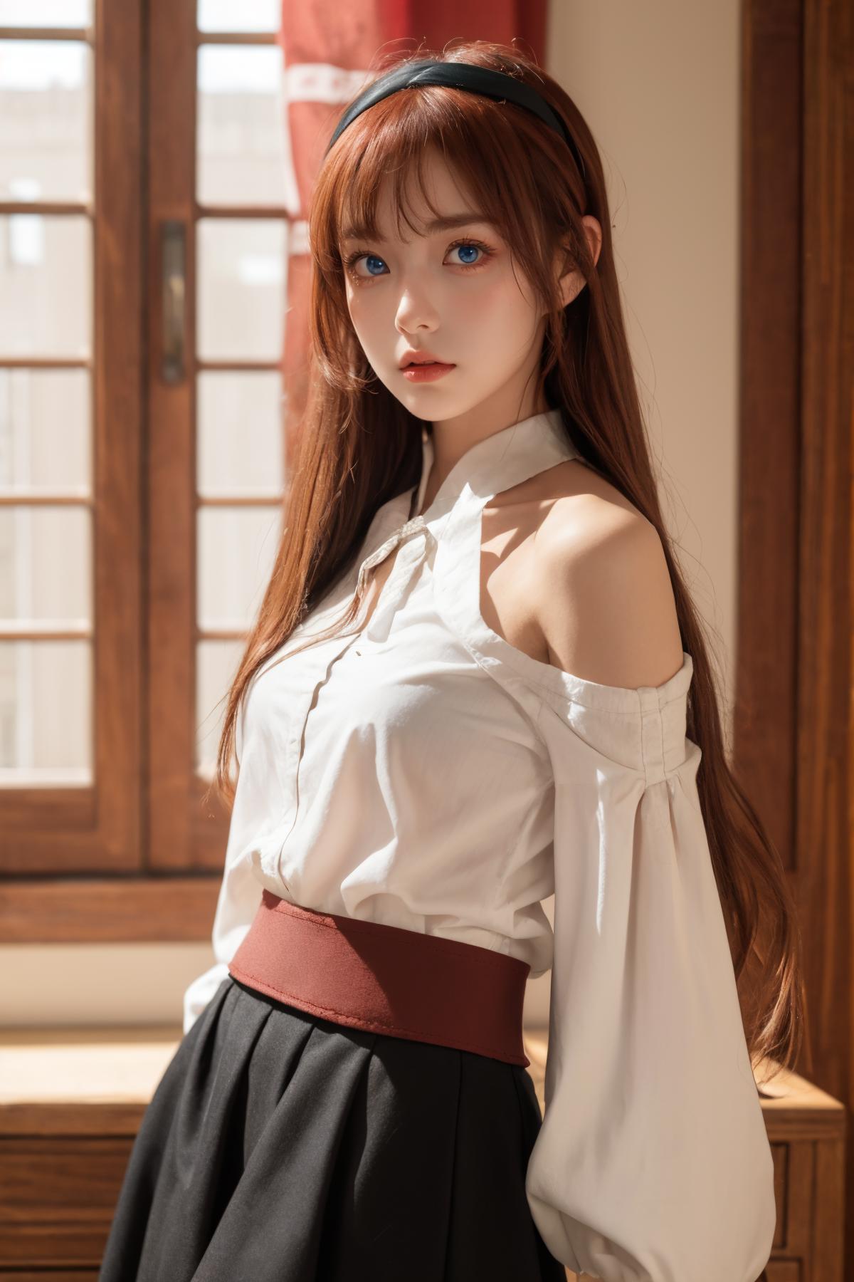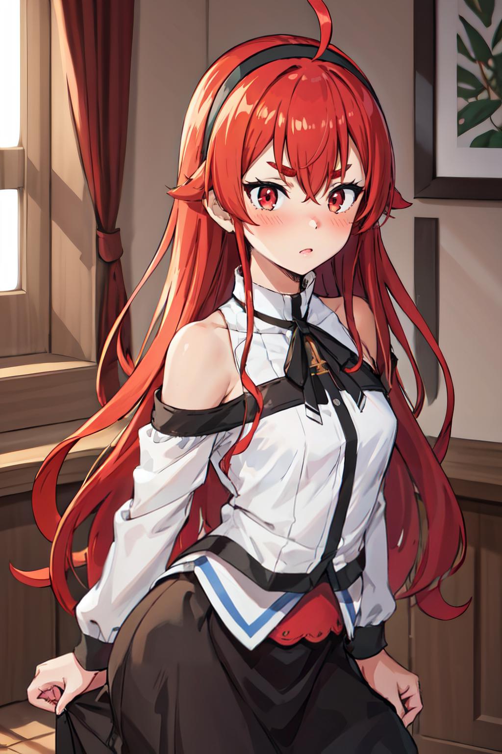 For her original outfit use the tags: pikkyeris, 1girl, solo, looking at viewer, red hair, long hair, bangs, hair between eyes, ahoge, very long hair, red eyes, breasts, small breasts, hairband, black hairband, thick eyebrows, bare shoulders, long sleeves, skirt, shirt, white shirt, black skirt, blush