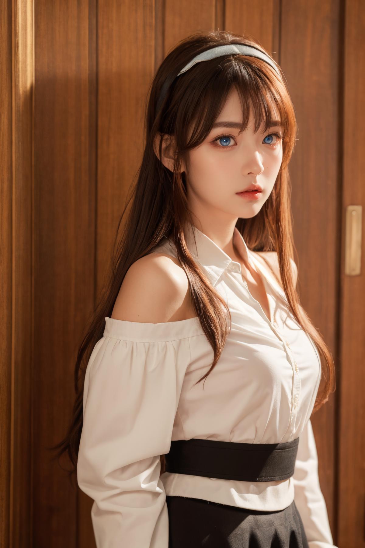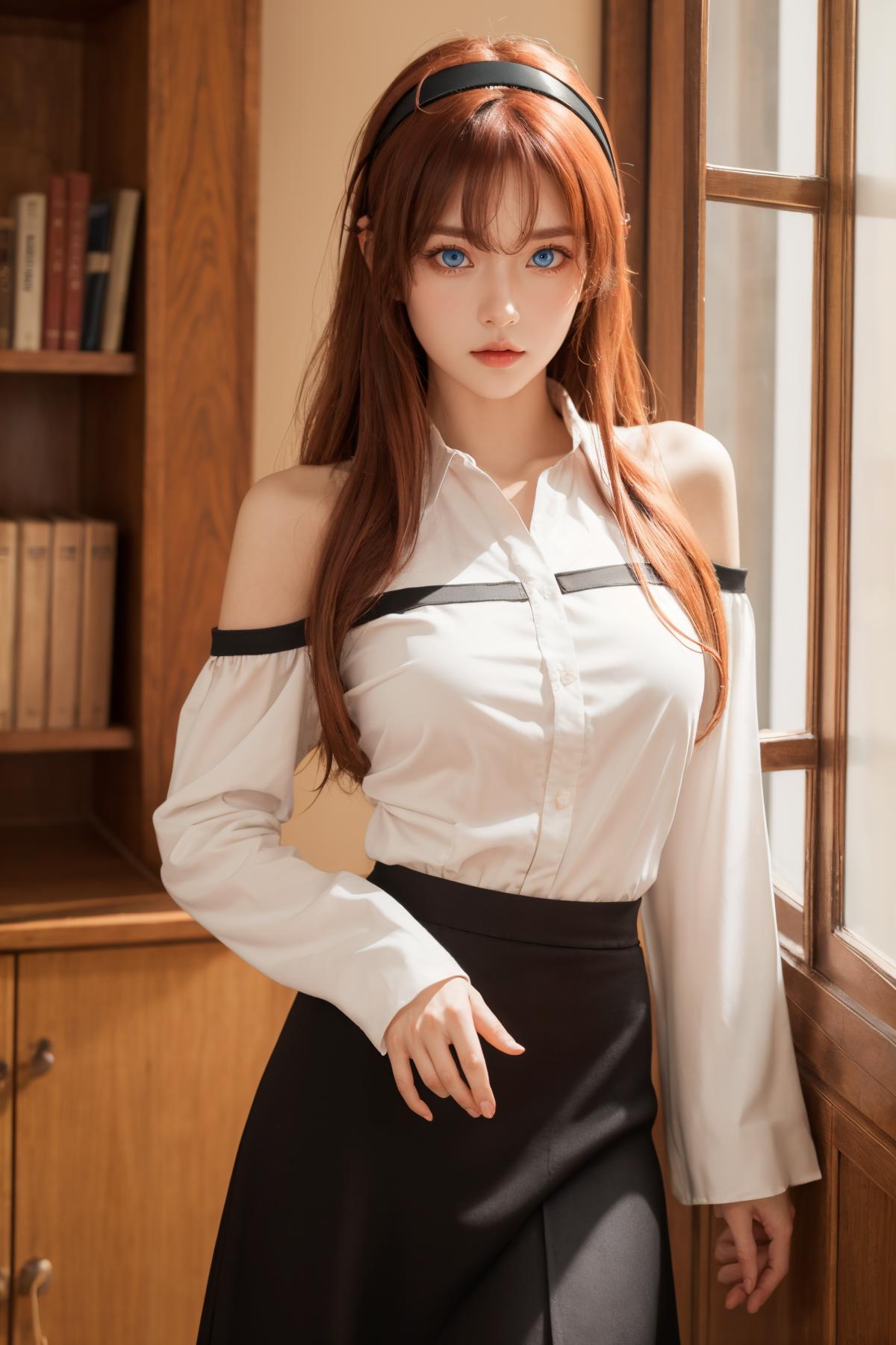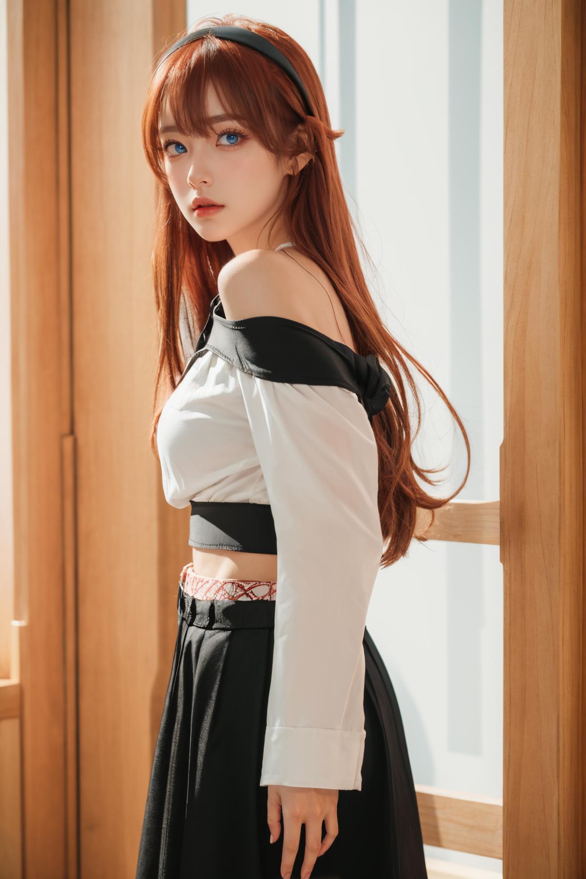 For her original outfit use the tags: pikkyeris, 1girl, solo, looking at viewer, red hair, long hair, bangs, hair between eyes, ahoge, very long hair, red eyes, breasts, small breasts, hairband, black hairband, thick eyebrows, bare shoulders, long sleeves, skirt, shirt, white shirt, black skirt, blush