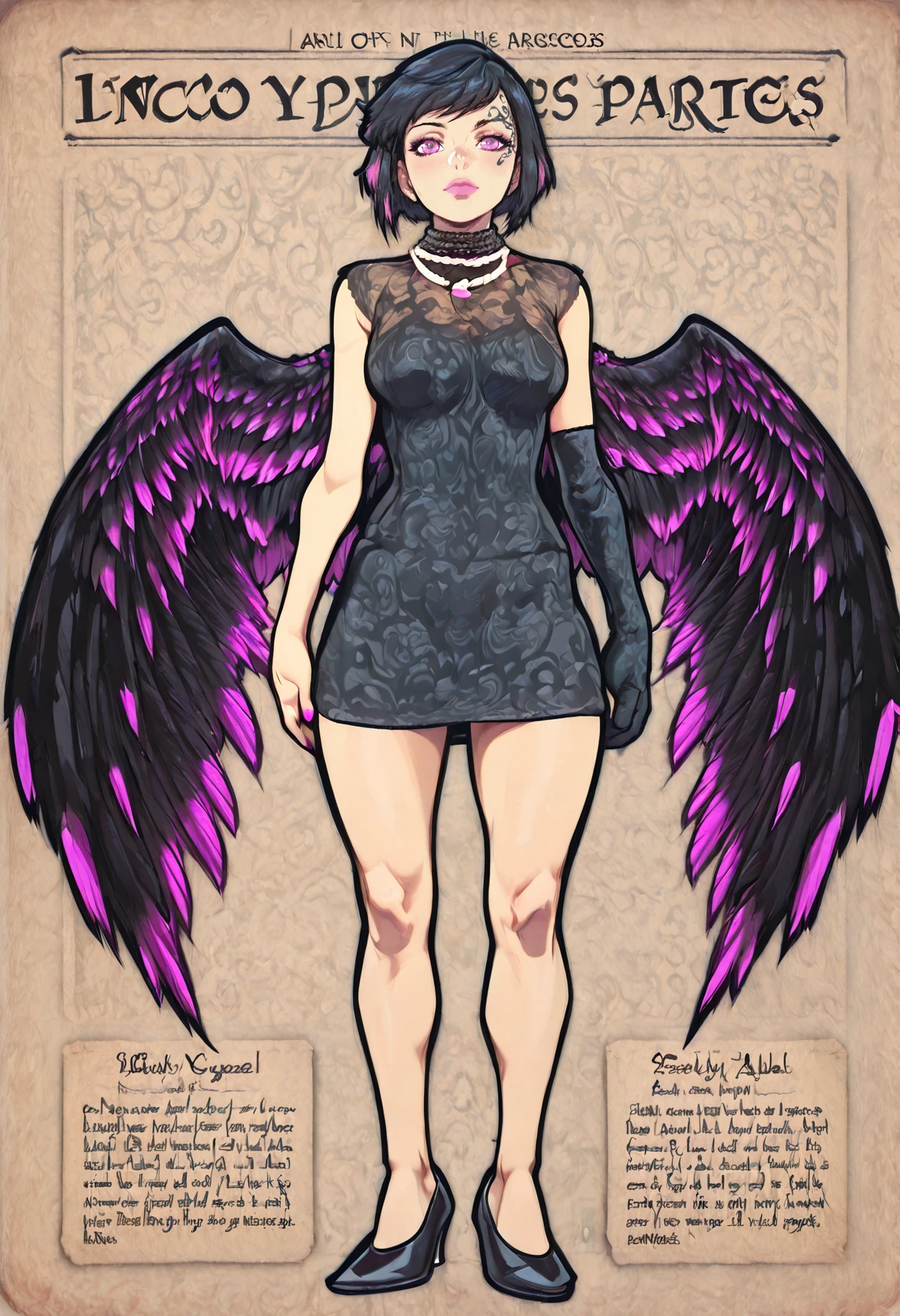 The other trigger for the prompt is for the detail of appearance and his outfit. : pointy ears, short hair, two tone hair, black hair, pink hair, hair over one eye, makeup, pink lips, pink eyes, pink nails, face tattoo, black dress, black left elbow glove, high heels, necklace, wings .