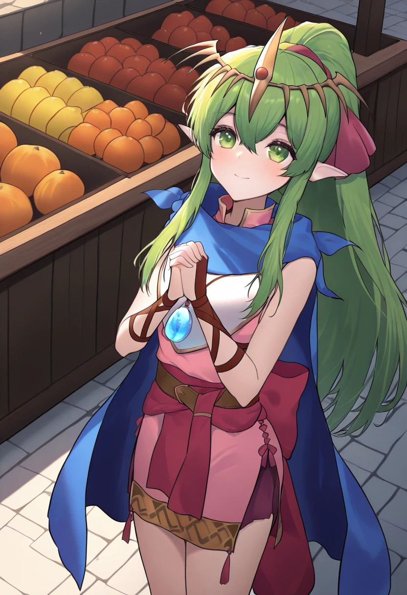 Trigger Words (Ascended): TikiAscend, green eyes, tiara, blue cape, pink dress, high collar, sleeveless, breastplate, stone pendant, cross-laced armlets, belt, red bow, side slit, dark red skirt, skirt under dress, ankle lace-up, brown boots,