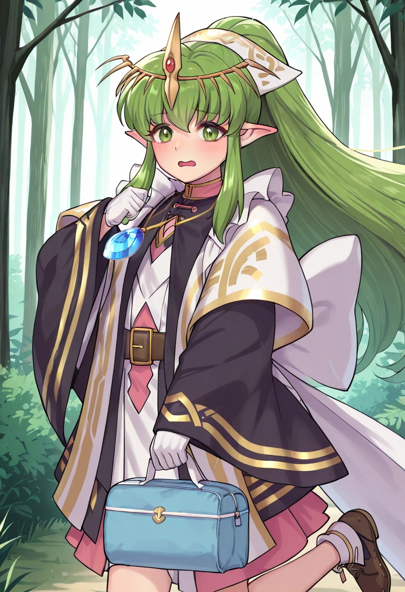 Trigger Words (Yggdrasil): TikiRespLeg, green eyes, tiara, nurse cap, gold trim, pink dress, high collar, layered dress, white dress, white stole, frills, black cloak, stone pendant, white gloves, back bow, white bow, belt, brown shoes, white cuffs,