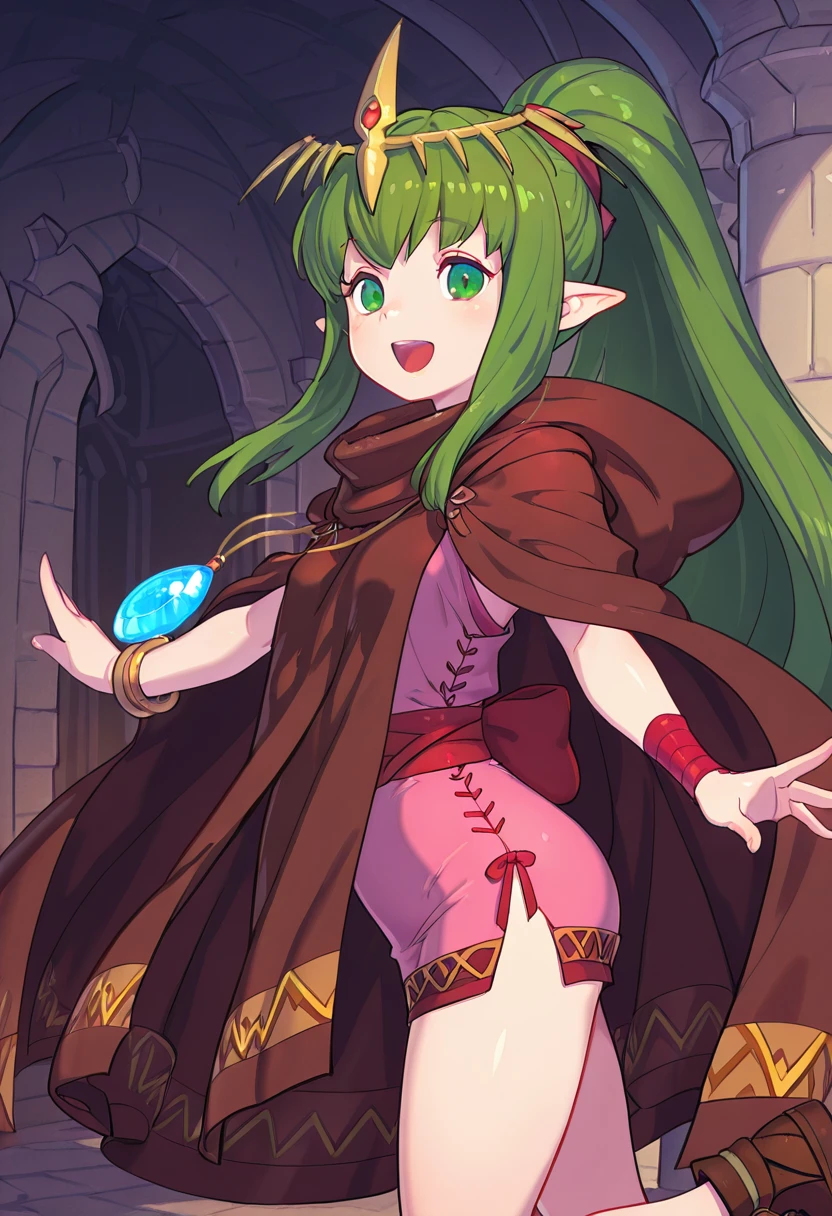Trigger Words (Legendary): TikiLegend, green eyes, tiara, brown cloak, hooded cloak, pendant, pink dress, short dress, sleeveless, bracelets, wrist ribbon, bridal gauntlet, red sash, side slit, brown shoes,