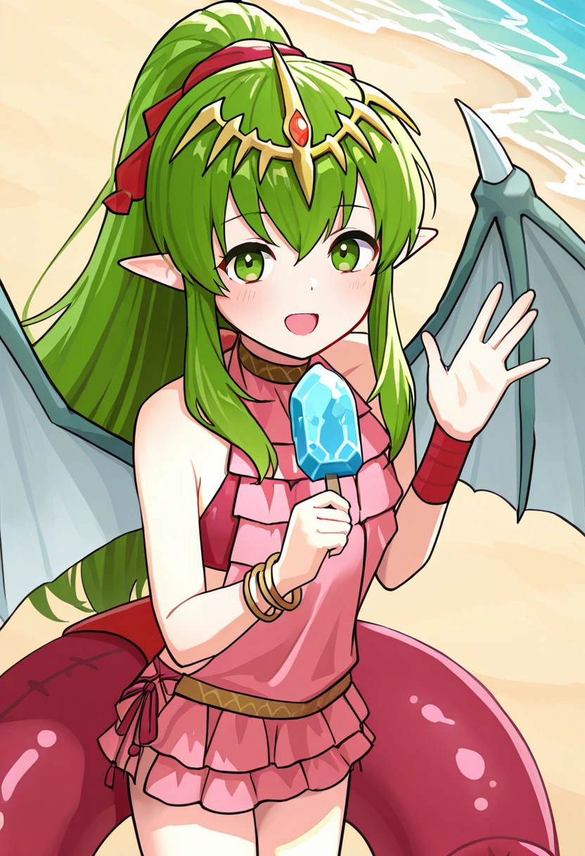 Trigger Words (Summer): TikiSummer, green eyes, tiara, dragon wings, silver wings, choker, pink swimsuit, red bikini, bikini under clothes, bracelets, red bridal gauntlet, red floatie, anklet,