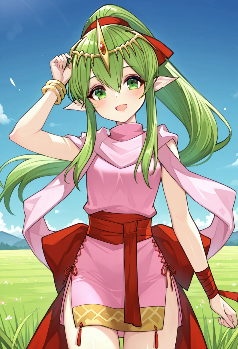Trigger Words (General): TikiArchanea, green hair, long hair, bangs, sidelocks, high ponytail, pointed ears,