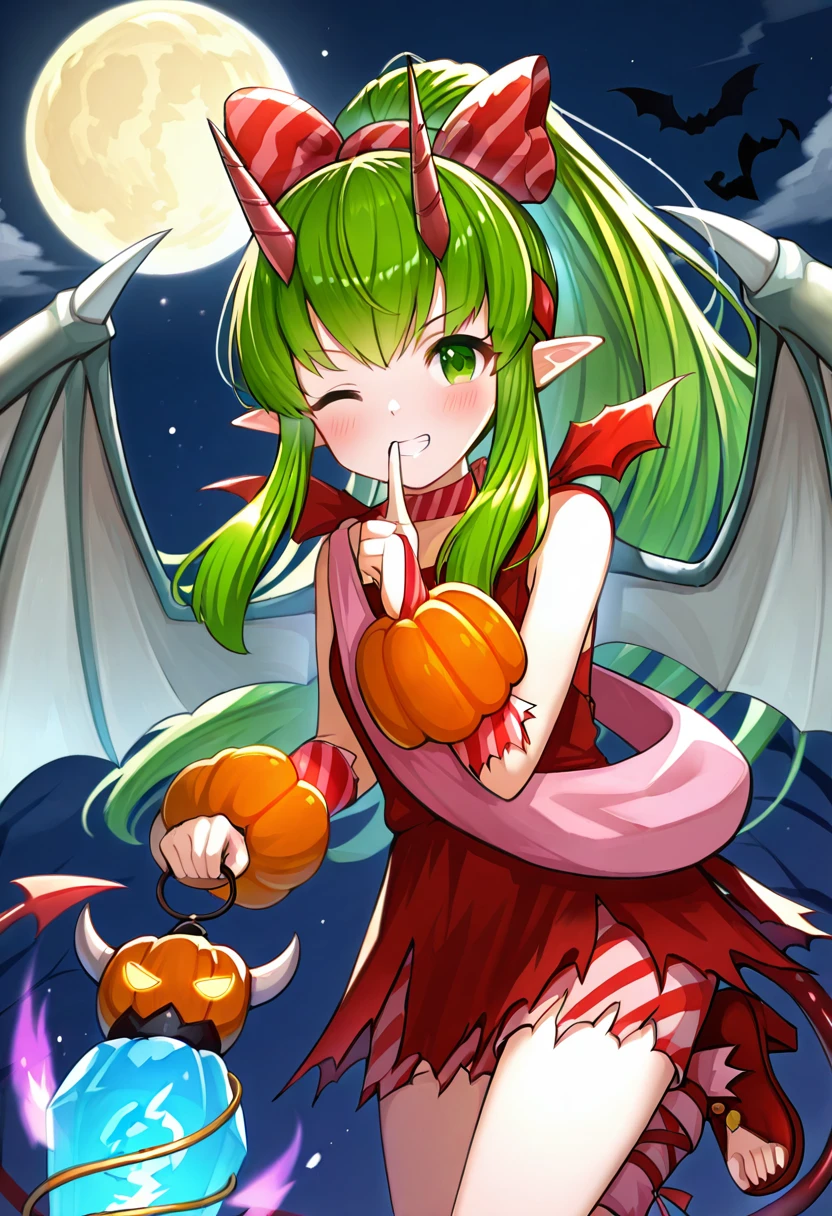 Trigger Words (Halloween): TikiHalloween, green eyes, tiara, dragon wings, silver wings, hair bow, horns, striped choker, red dress, short dress, torn dress, sleeveless, shoulder bag, striped bridal gauntlets, pumpkin bracelets, striped shorts, torn shorts, devil tail, leg warmers, open-toe boots, high heel boots,