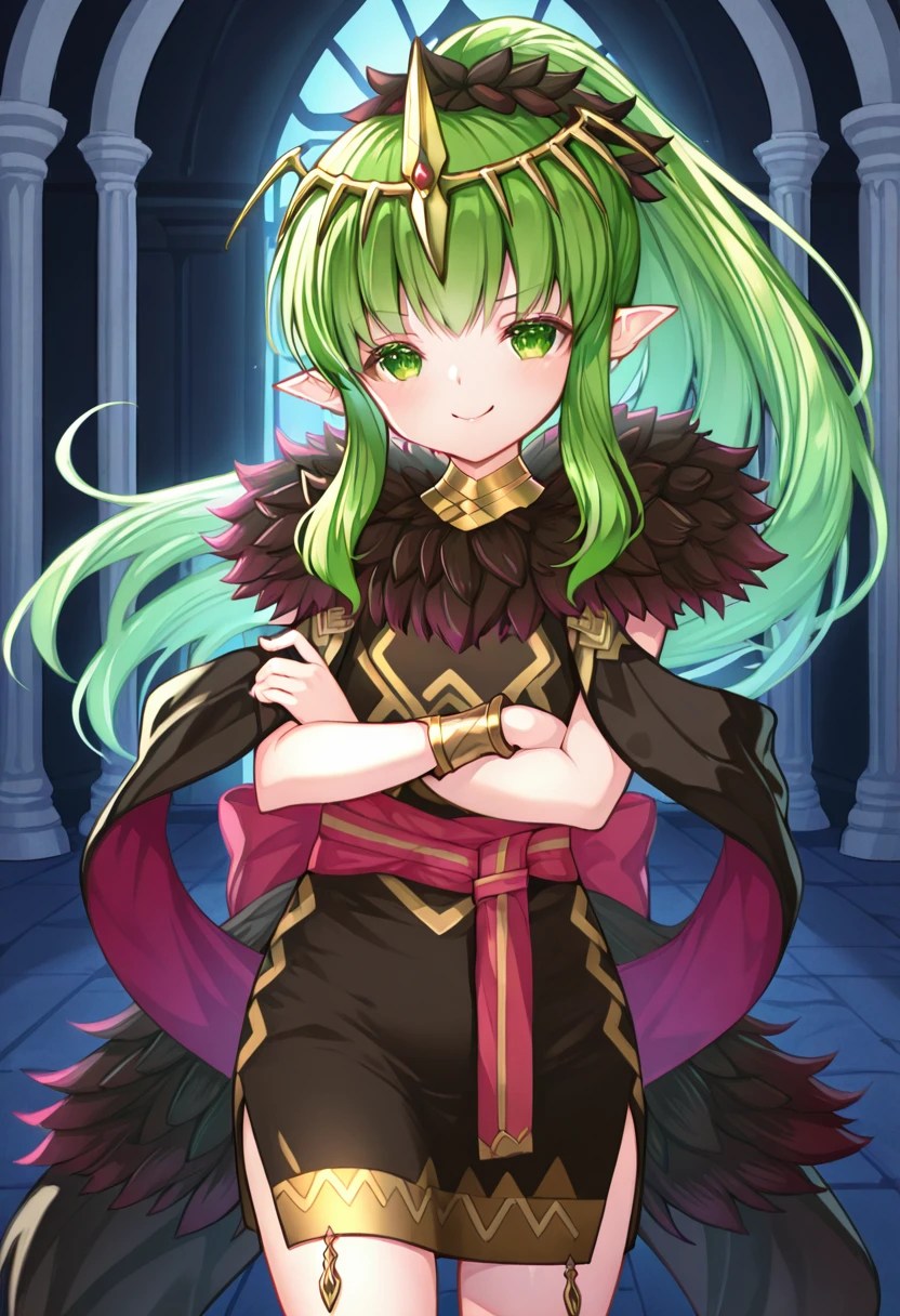 Trigger Words (Embla): TikiRespOG, green eyes, tiara, black dress, feather trim, gradient feathers, two-tone shawl, short dress, sleeveless, bracelets, bangle, red sash, side slit, large shawl, red shoes,