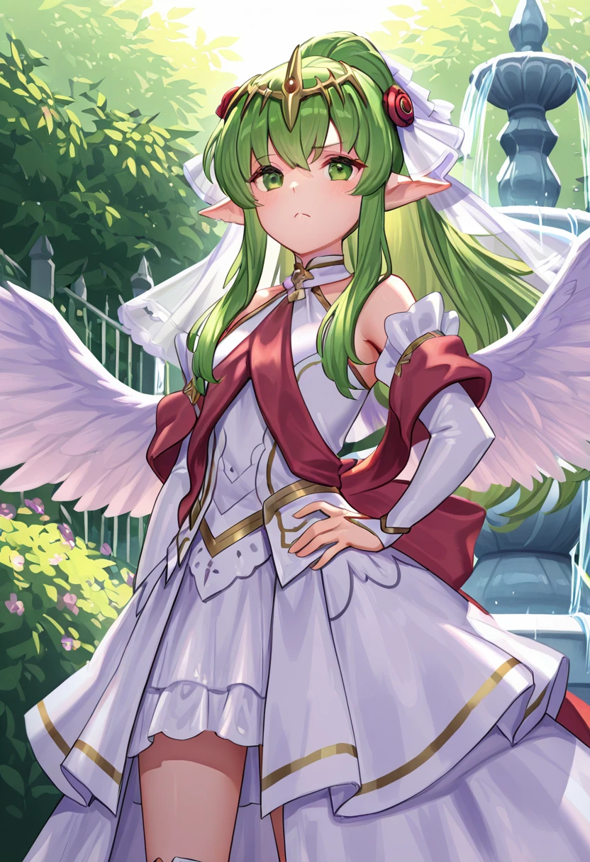 Trigger Words (Bride Festival): TikiBridal, green eyes, tiara, hair flower, bridal veil, bridal dress, halterneck, red shawl, white wings, detached sleeves, bare shoulders, white bridal gauntlets, layered skirt, high-low skirt, white high heels,