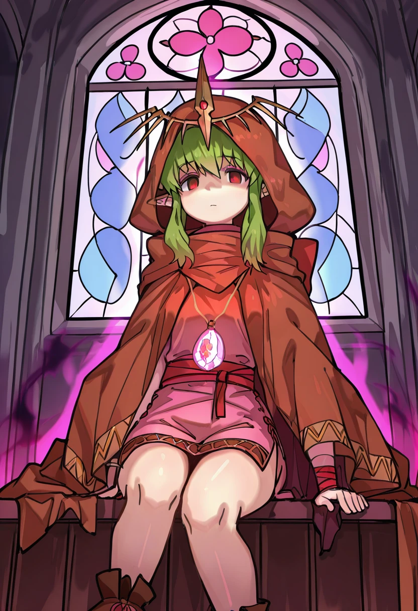 Trigger Words (Fallen): TikiFallen, red eyes, tiara, brown cloak, hooded cloak, pink pendant, pink dress, short dress, sleeveless, bracelets, wrist ribbon, red sash, side slit, brown shoes, dark aura,