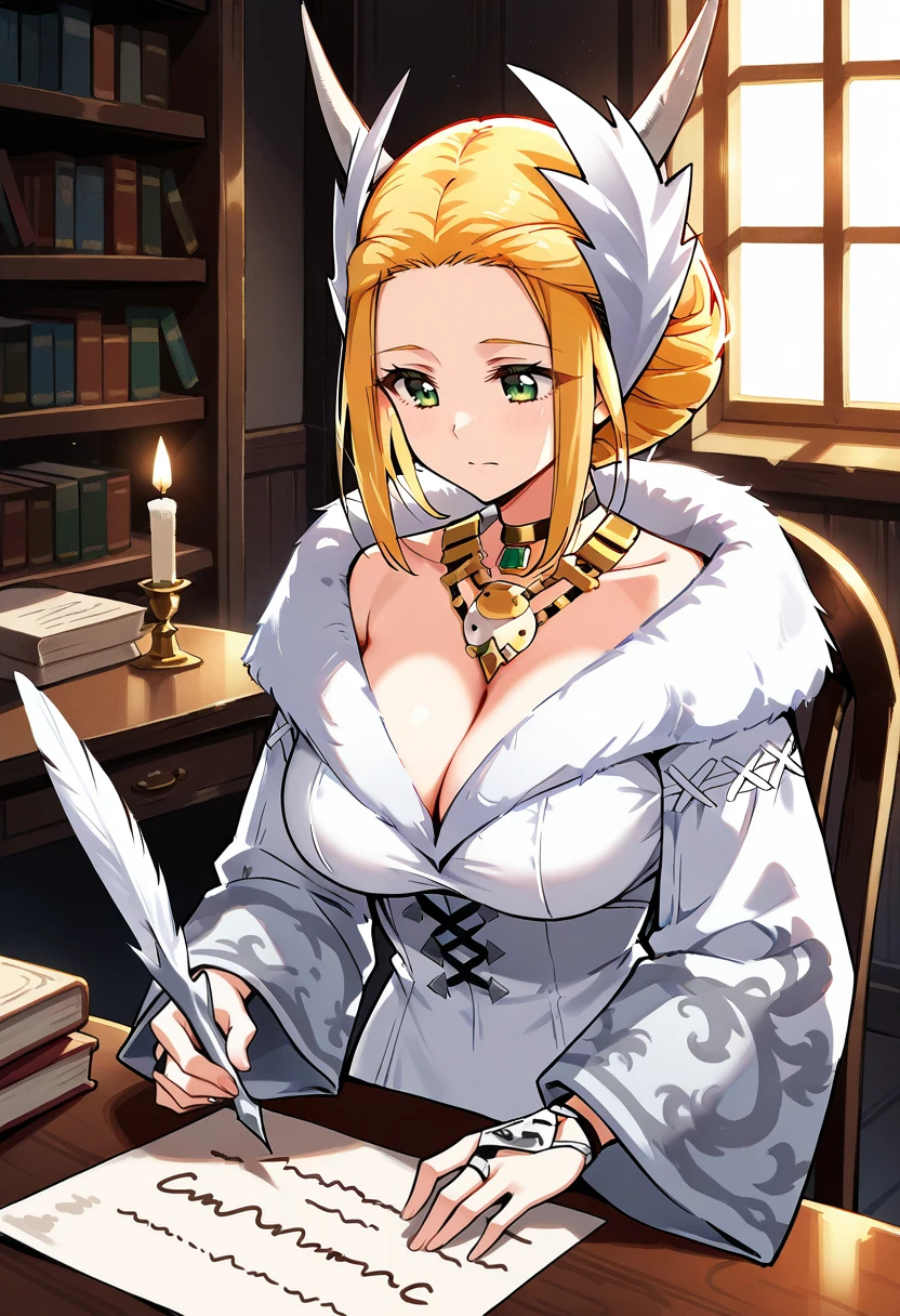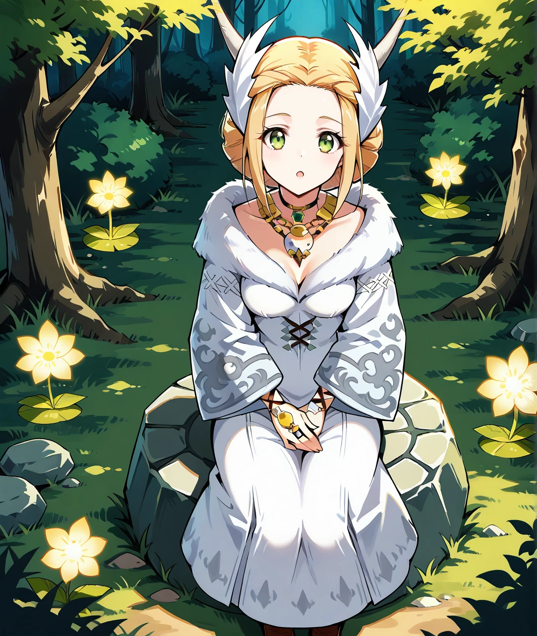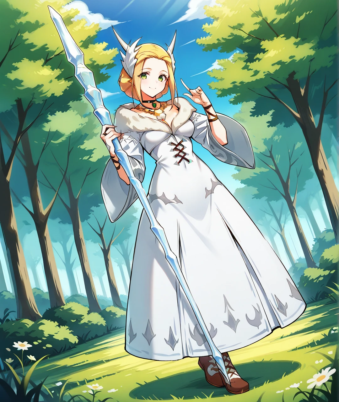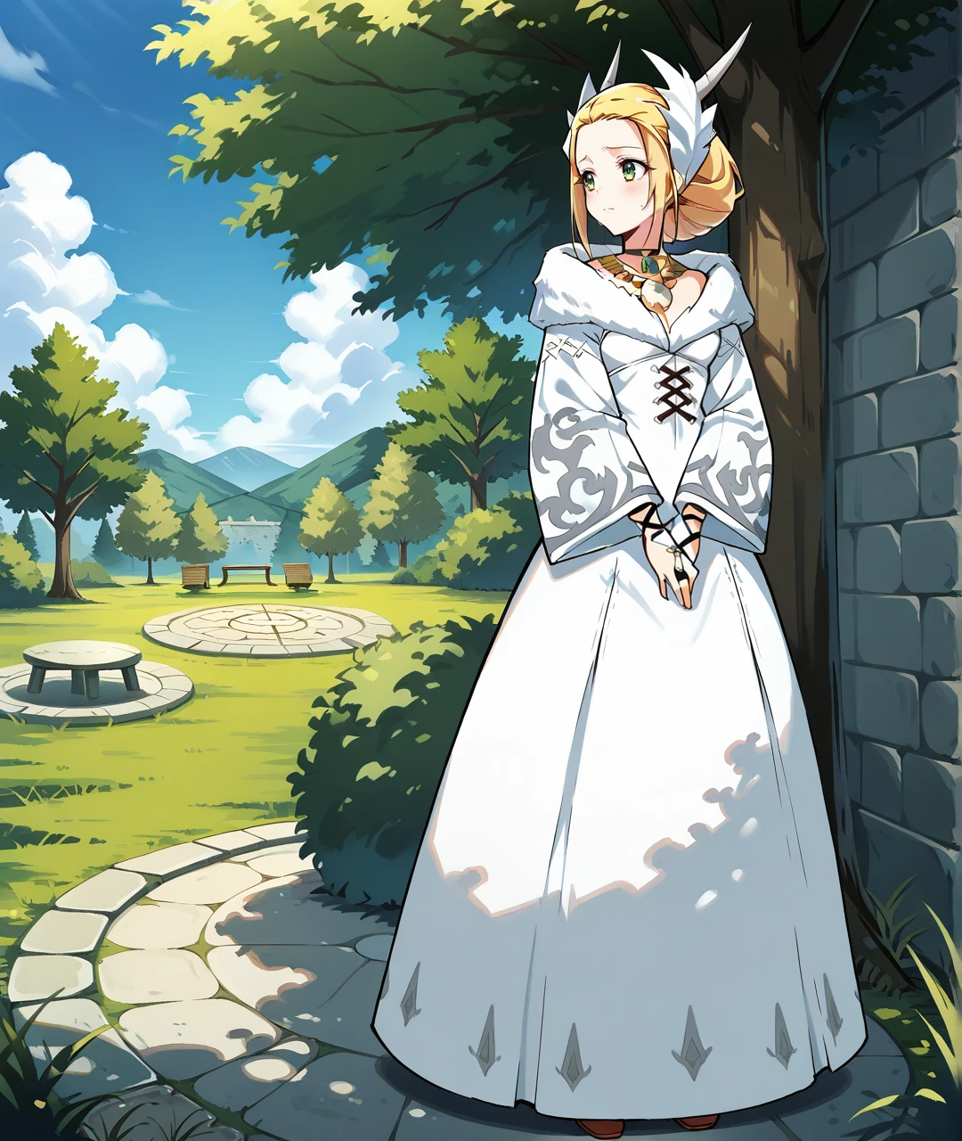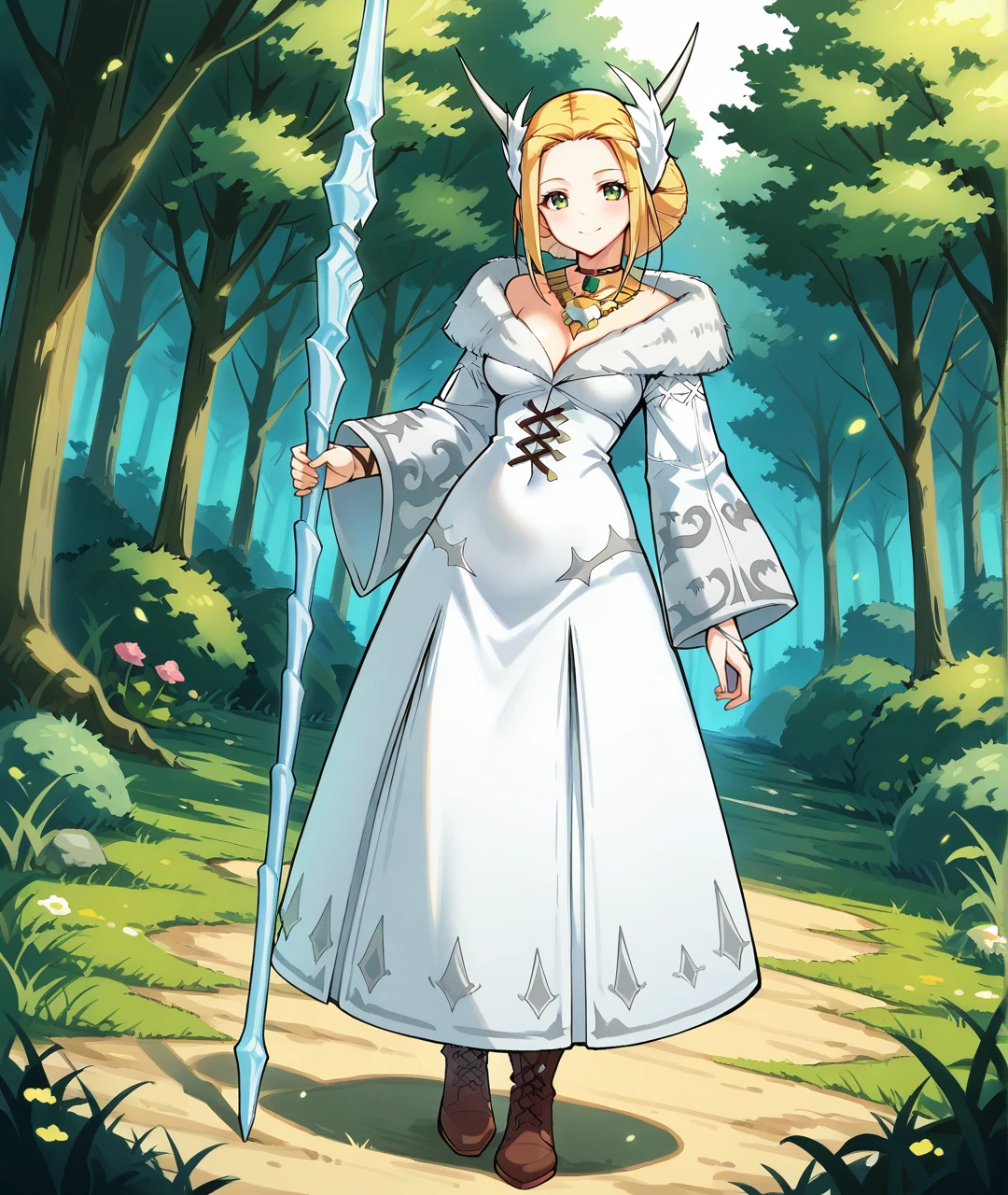 Tags: KanESennaBase, green eyes, blonde hair, long hair, hair bun, horns, white hair ornament, forehead, black choker, necklace, jewelry, collarbone, medium breasts, fur trim, cross-laced clothes, white dress, long sleeves, wide sleeves, bridal gauntlets, brown boots,