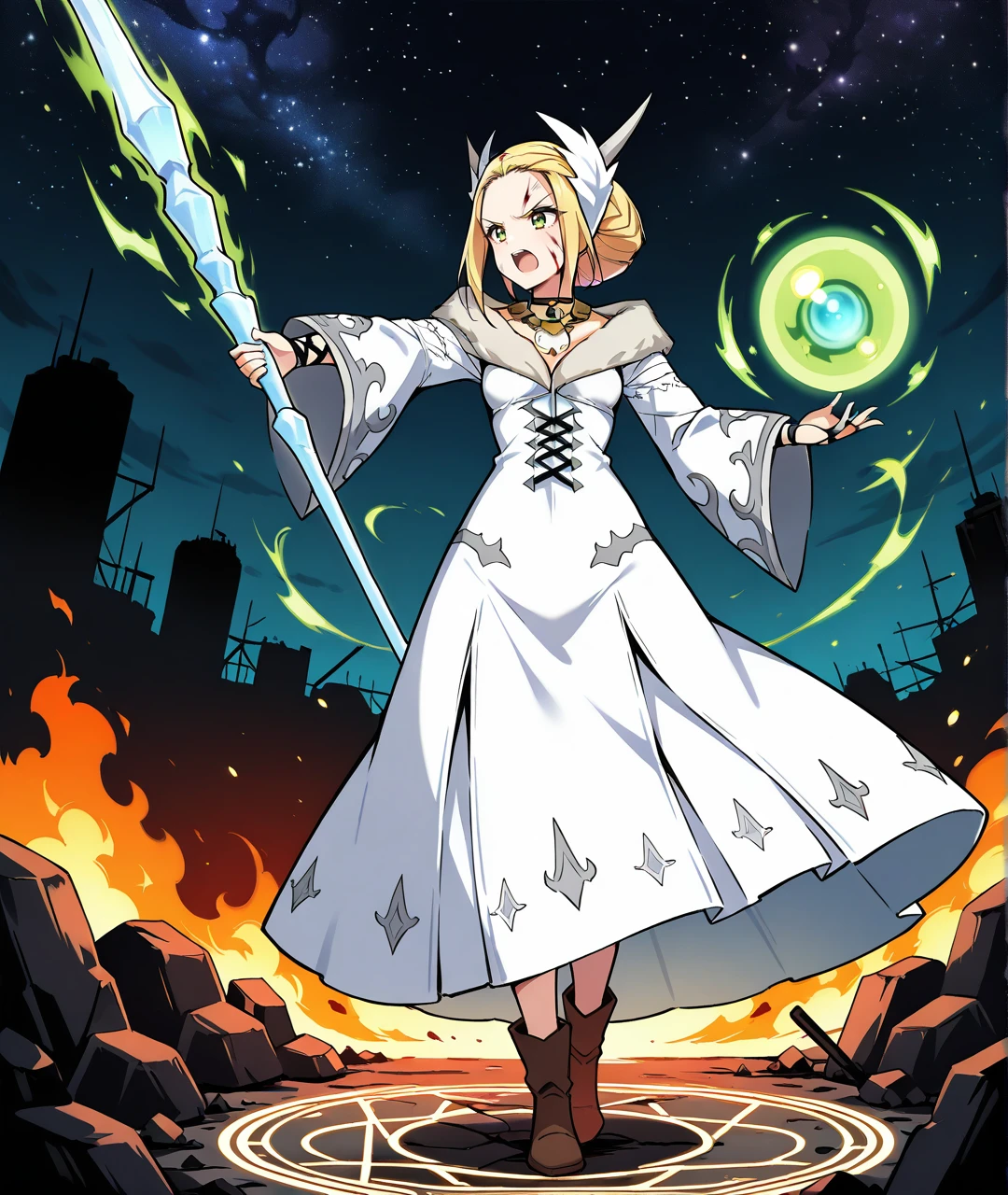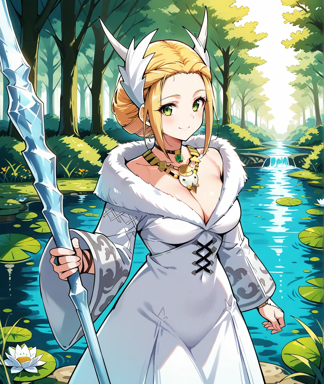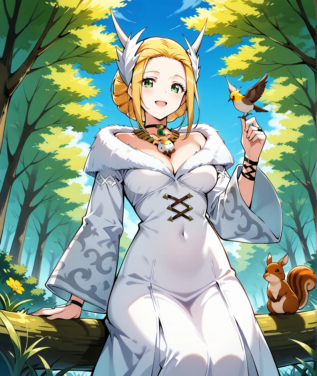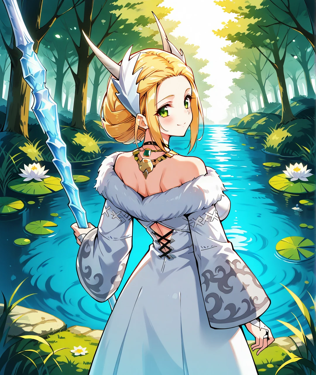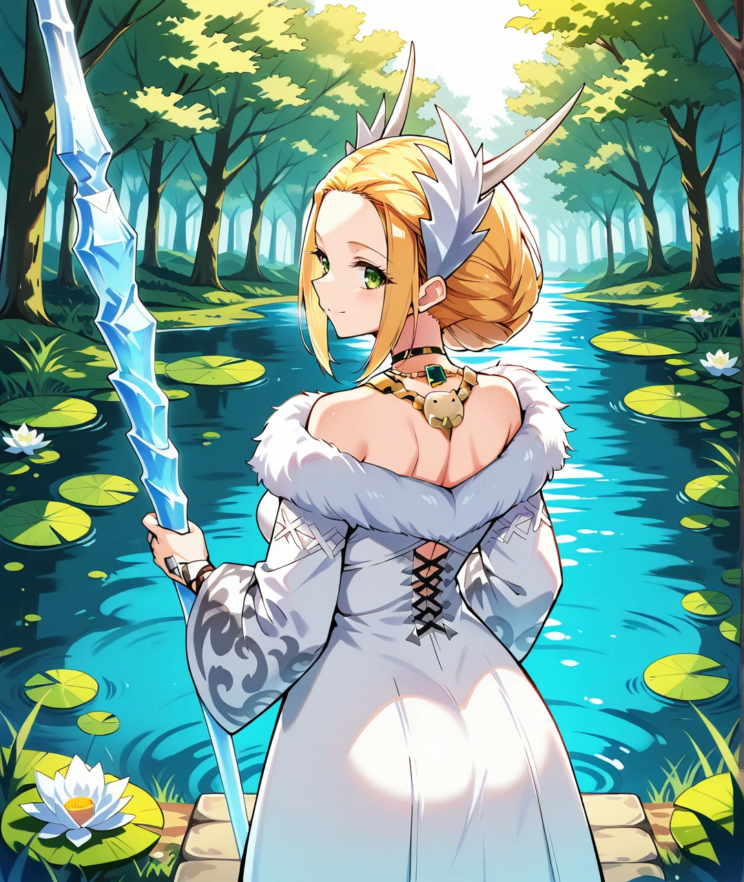 Tags: KanESennaBase, green eyes, blonde hair, long hair, hair bun, horns, white hair ornament, forehead, black choker, necklace, jewelry, collarbone, medium breasts, fur trim, cross-laced clothes, white dress, long sleeves, wide sleeves, bridal gauntlets, brown boots,