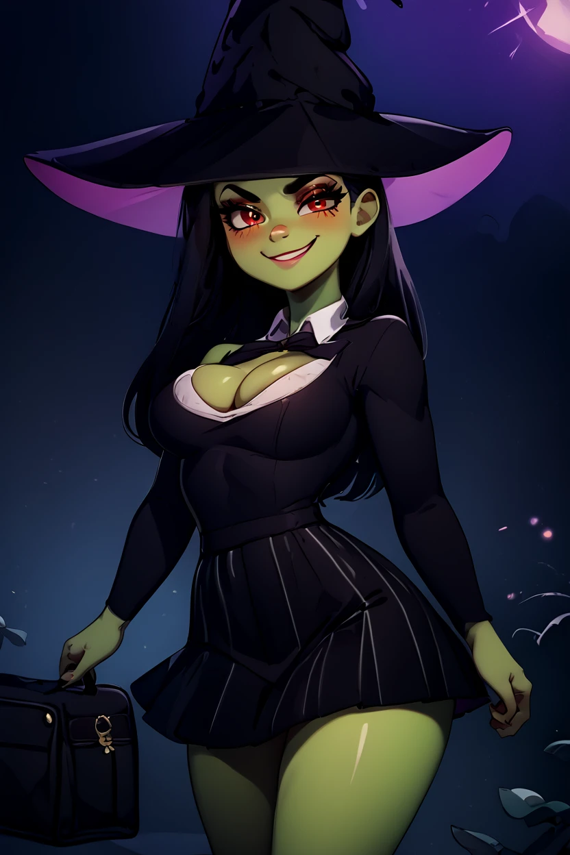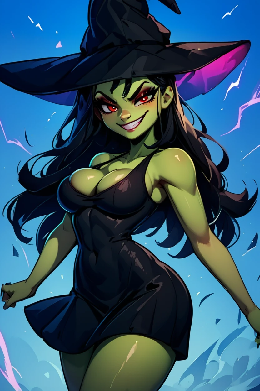 zzGrunty, green skin, long black hair, black dress, red eyes, witch hat, dress, large breasts, black dress, cleavage, makeup, sleeveless, black dress, short dress, evil smile, smug, busty,