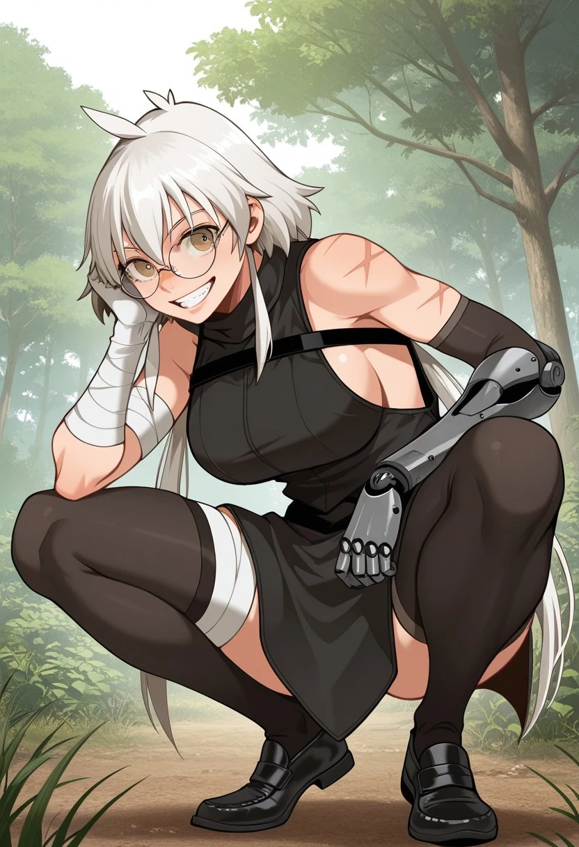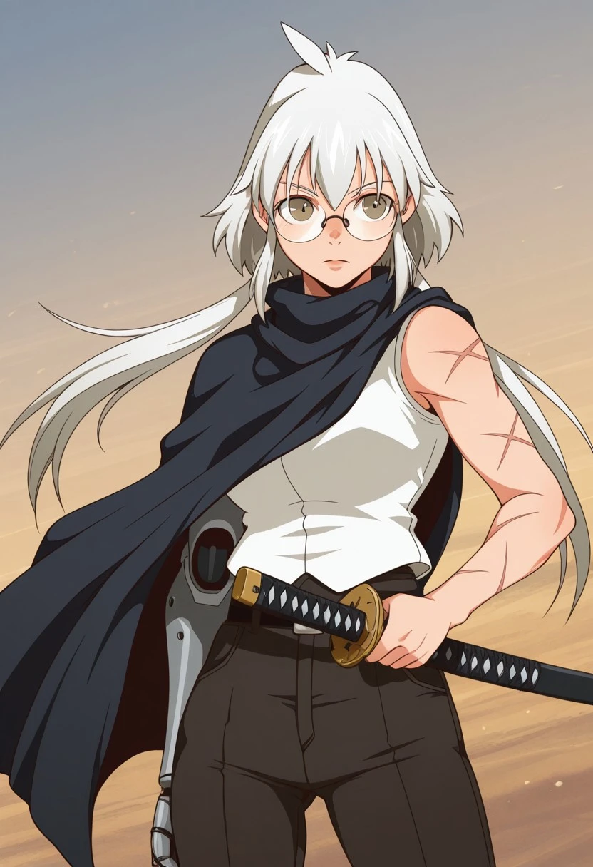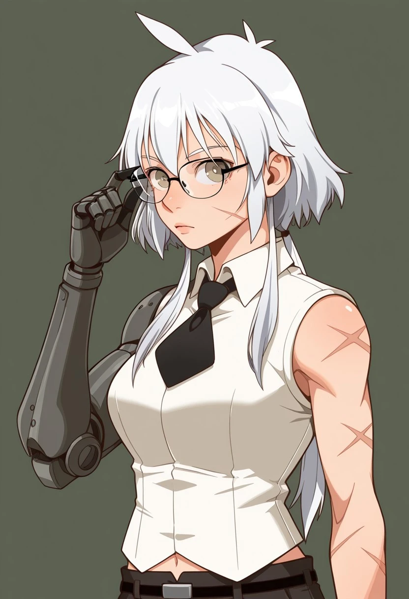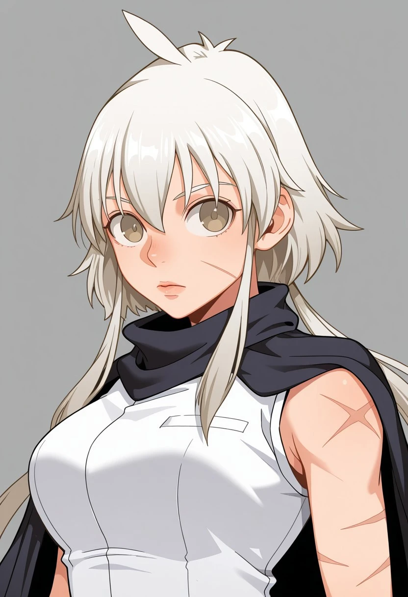 Yoo Mira, white long hair, scars, pale yellow eyes,