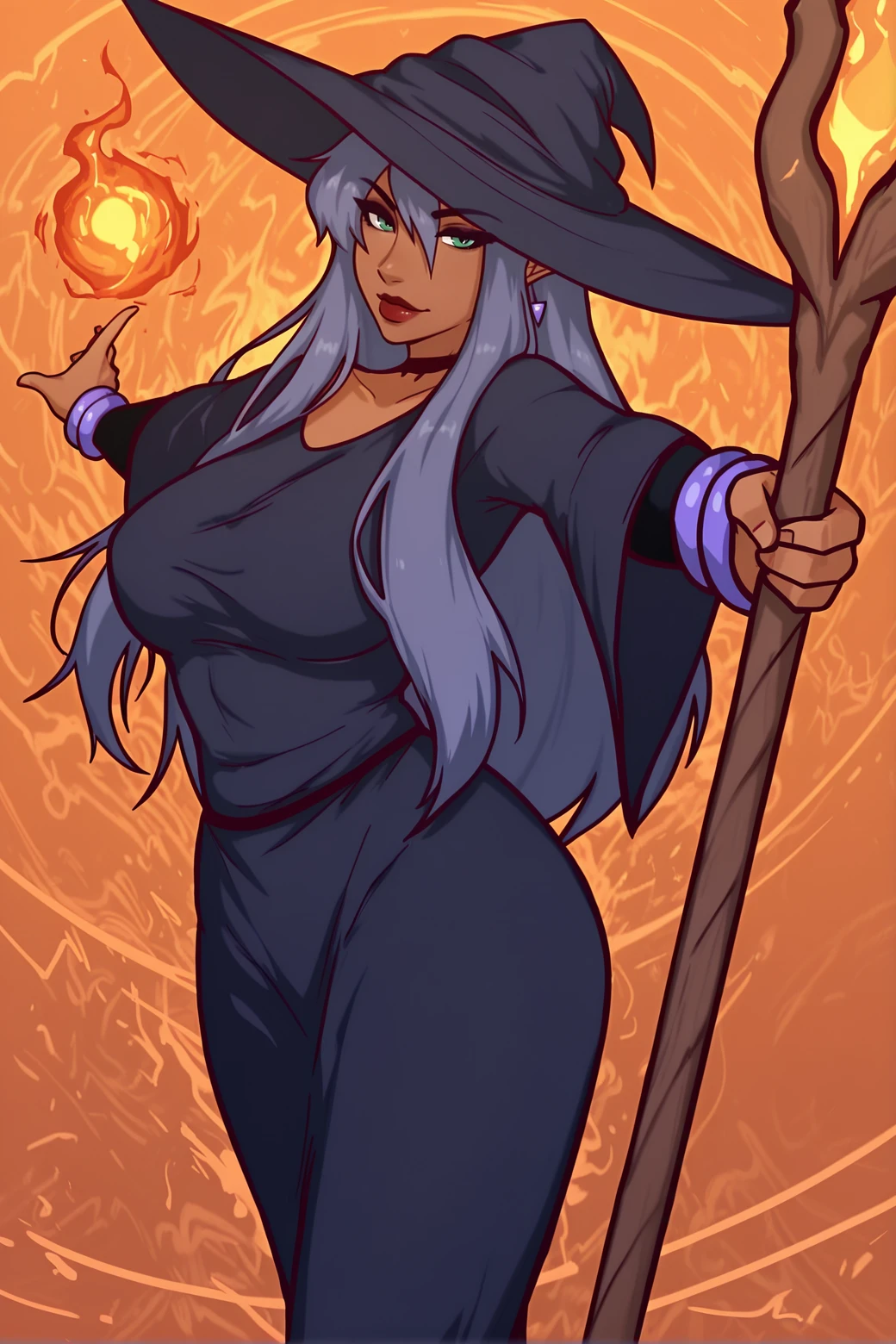 wizard hat, two tone clothing, baggy clothing, black clothing, long sleeves, robe, purple bracelets,