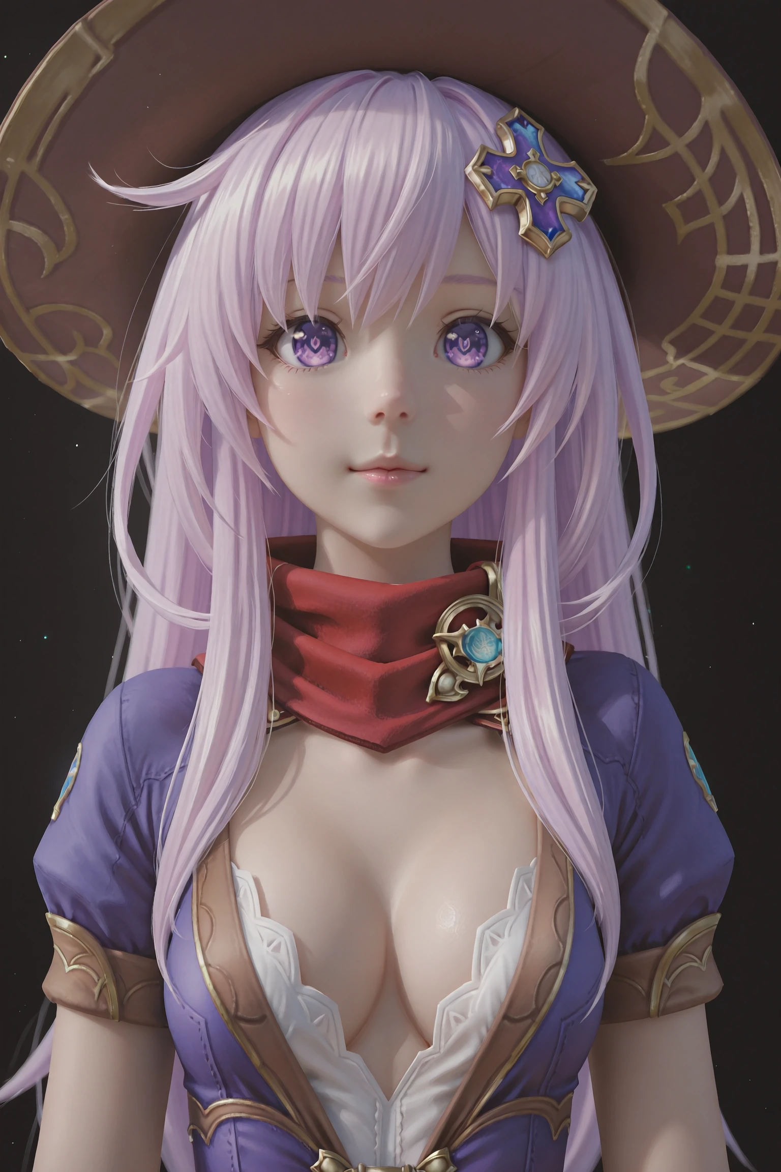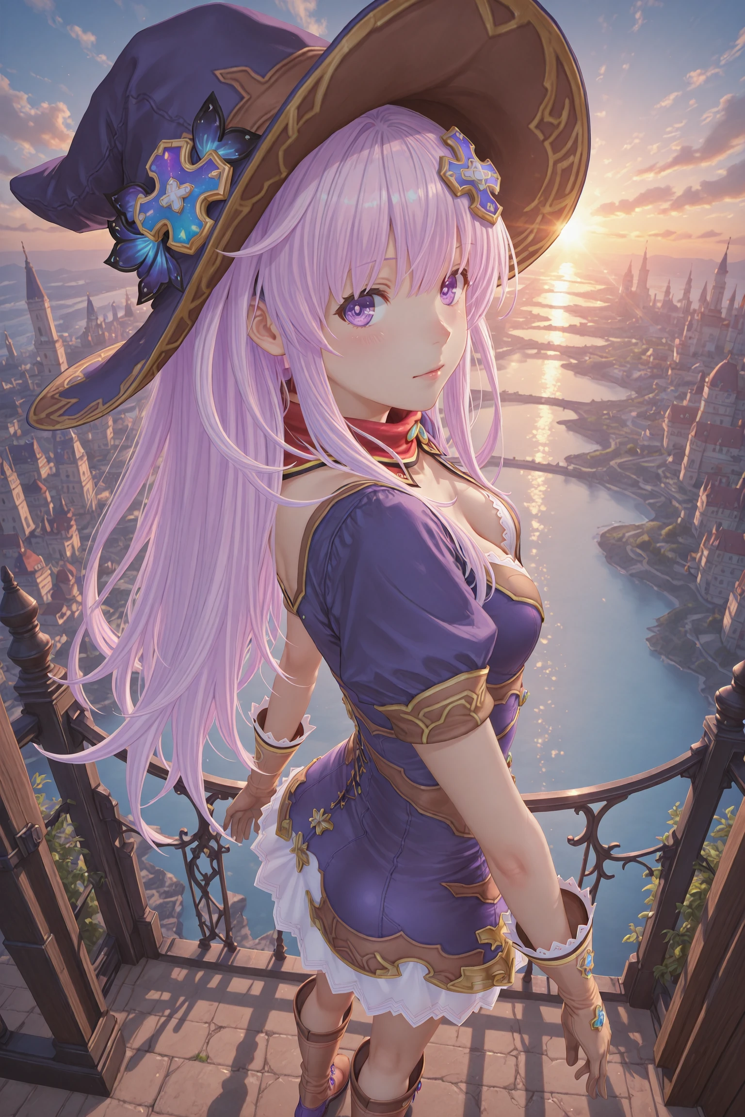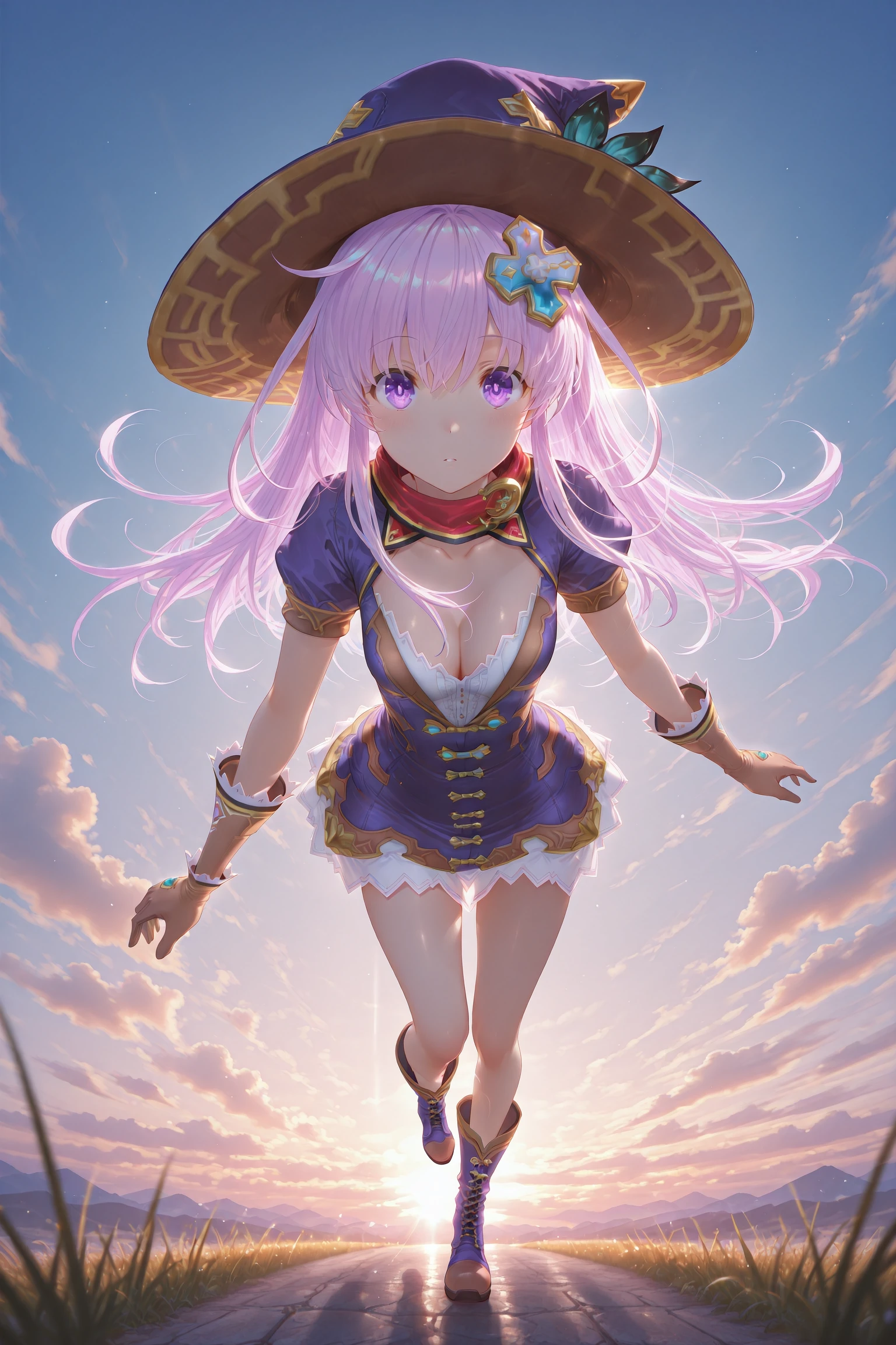 Nepgear,1girl,nepgear,solo,purple eyes,hair ornament,hat,dress,gloves,long hair,purple hair,boots,short dress,d-pad,d-pad hair ornament,