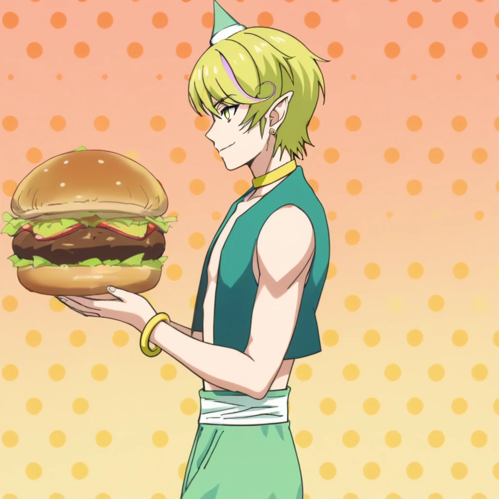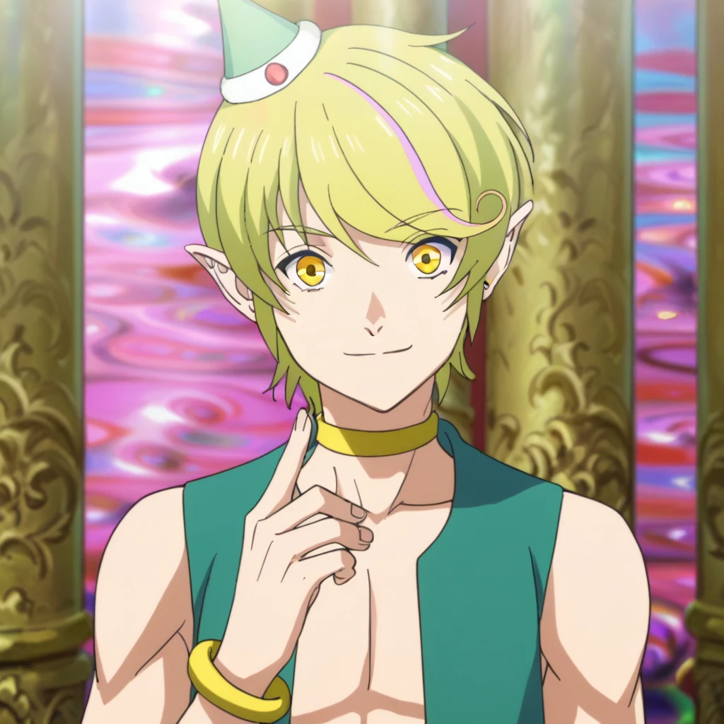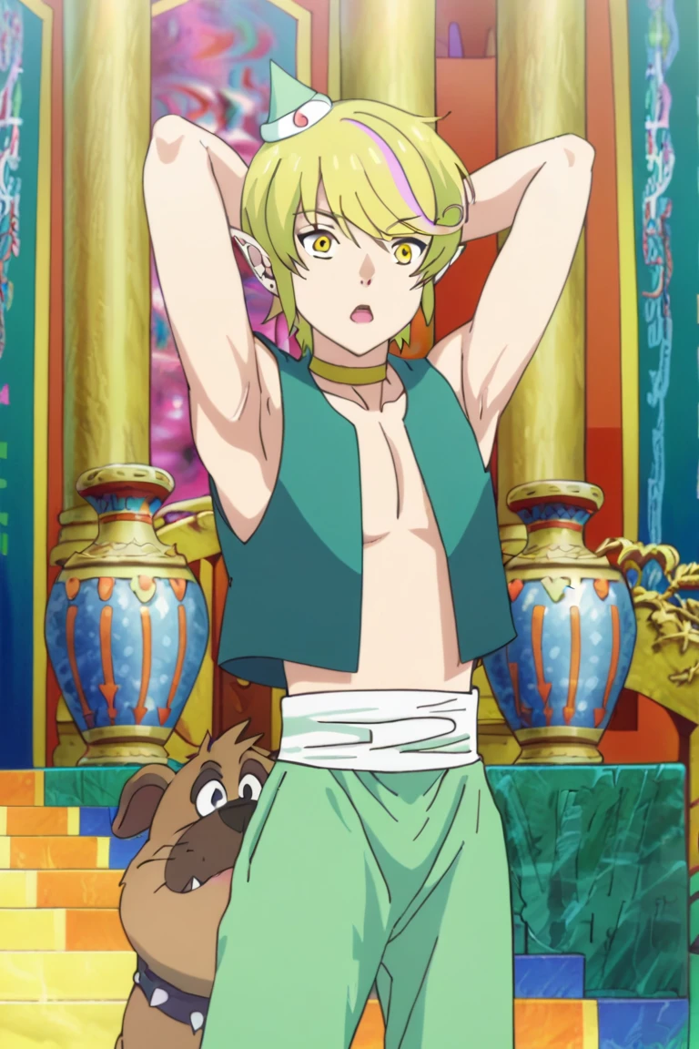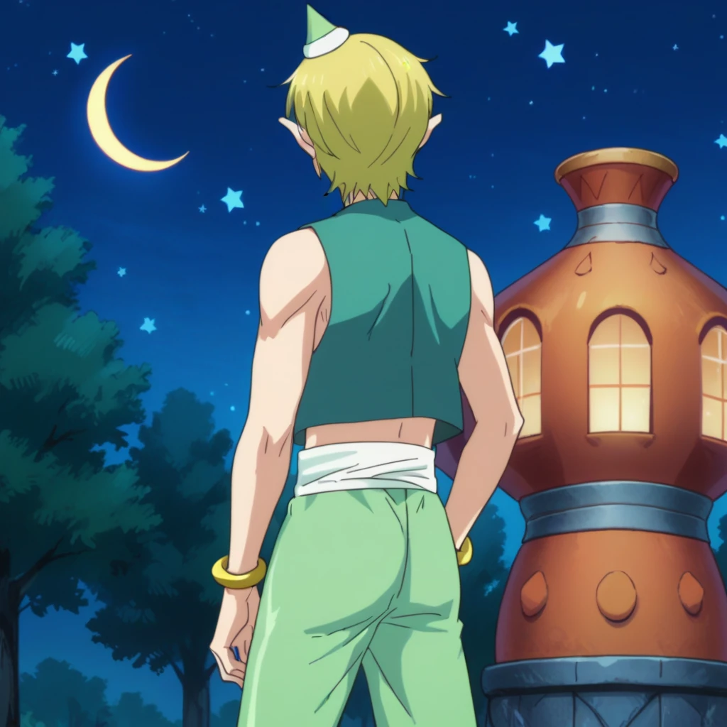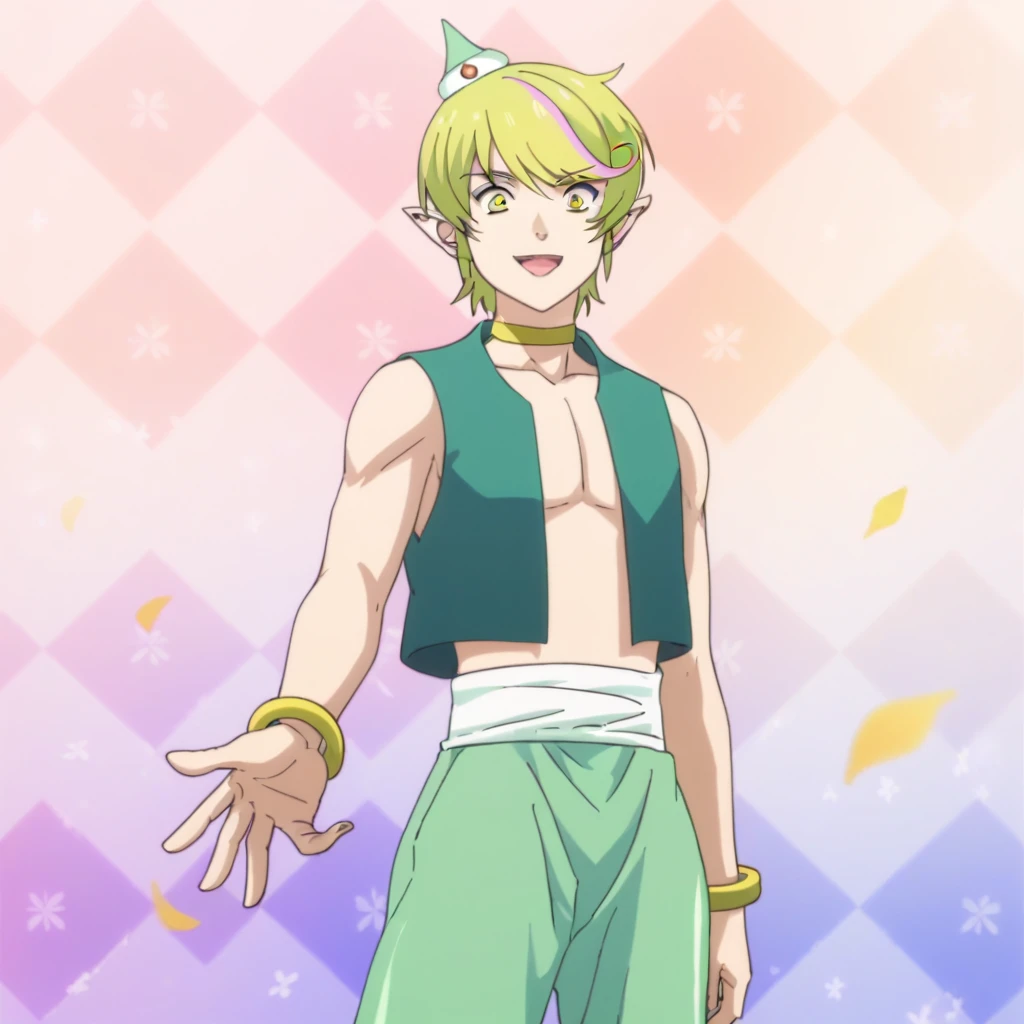 Prompts: male, multicolored hair, two-tone hair, streaked hair, blonde hair, pink hair, hat, yellow eyes, pointy ears, earrings, jewelry, choker, teal vest, sleeveless, open clothes, bracelets, waistband, green pants, pointy shoes, indoors (castle/throne/stairs/vase/pillar/sunlight), outdoors (jar-shaped house/door/window/tree/night sky/crescent moon/star (sky)), checkered background/bubbles/sparkle, polka dot background, flower background
