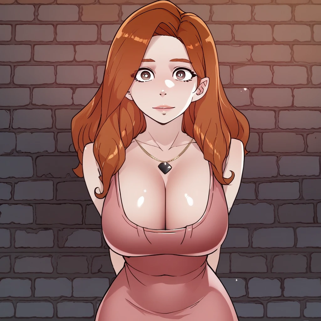 1. ((sexy sleeveless pink dress, obscene cleavage, huge cleavage, gold necklace with black pendant, )) sexy white panties, beige high-heels, beige bag, earrings,