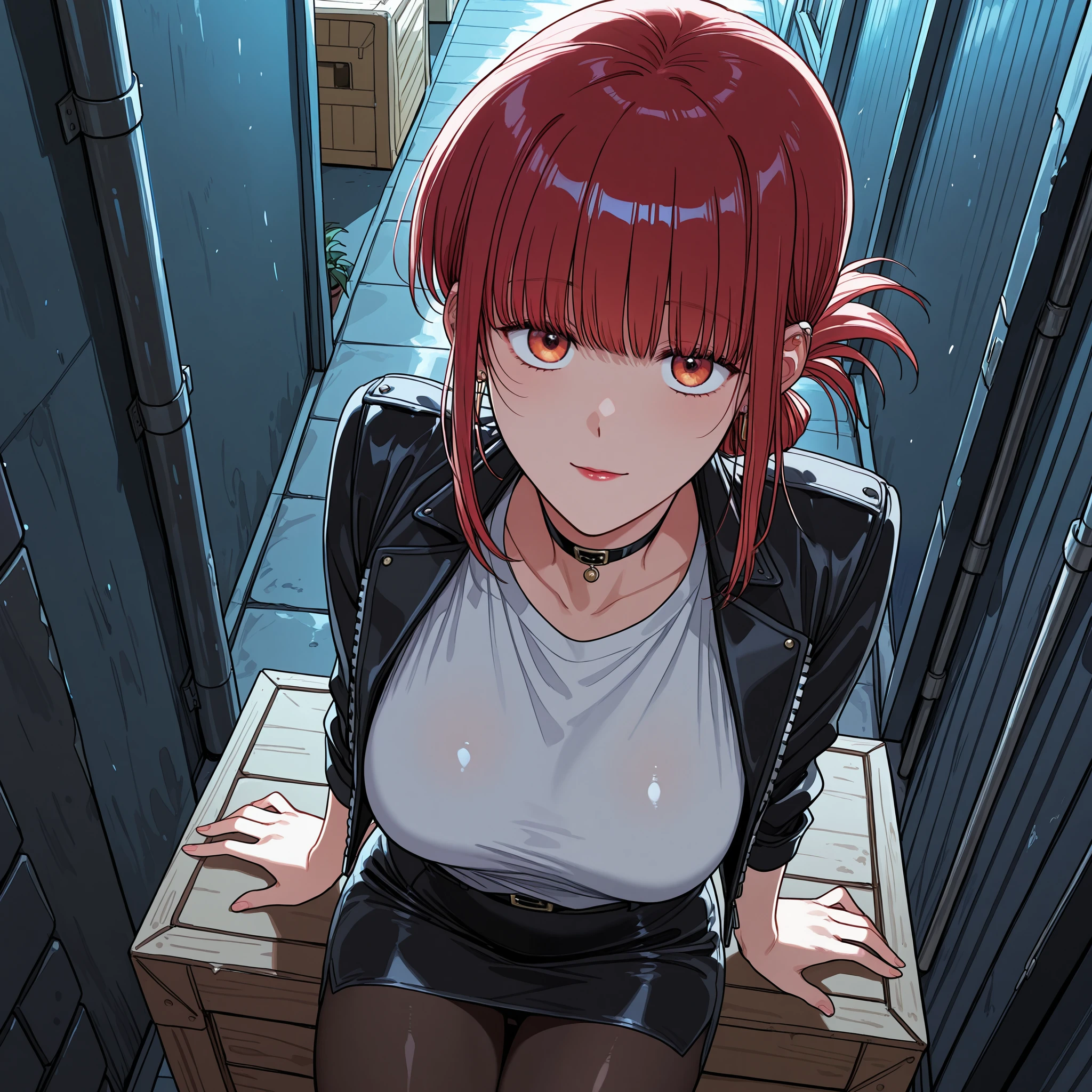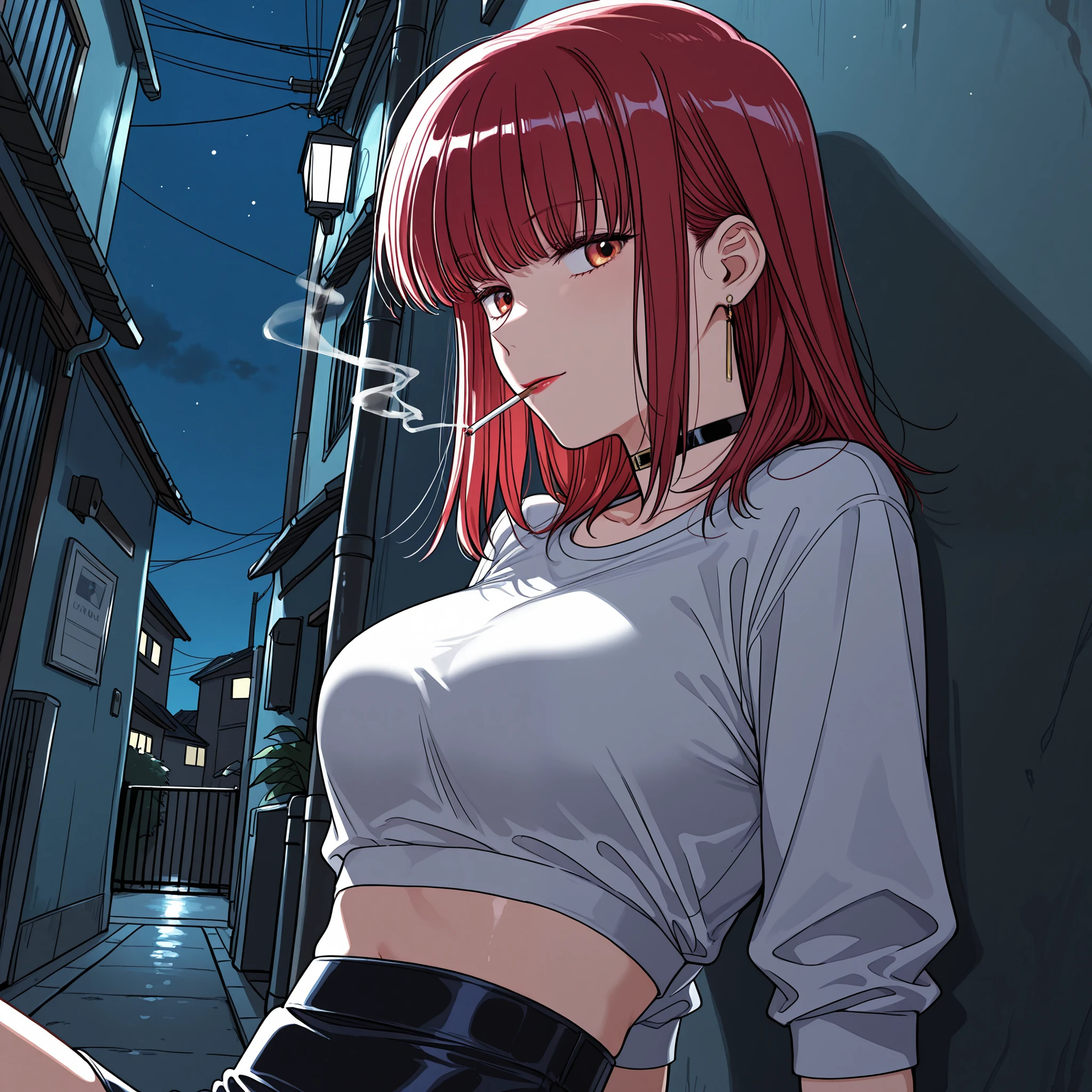 Useful keywords: red hair,folded ponytail, blunt bangs, red eyes, orange eyes,lipstick