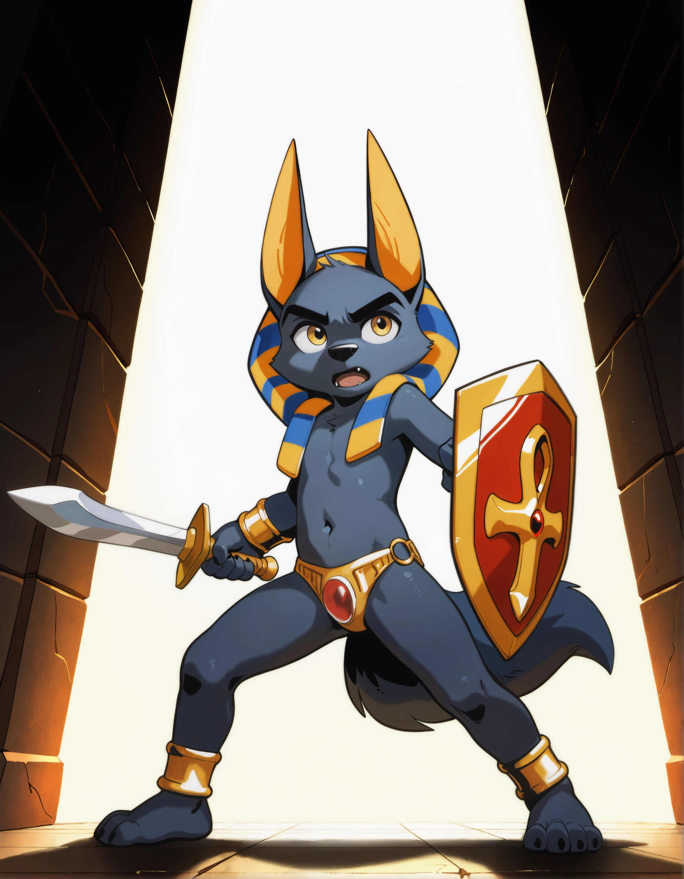 Appearance/Accessory trigger words are gold eyes, thick eyebrows, gold wrist bracelets, gold ankle bracelets, gold thong with red jewel, sword, shield