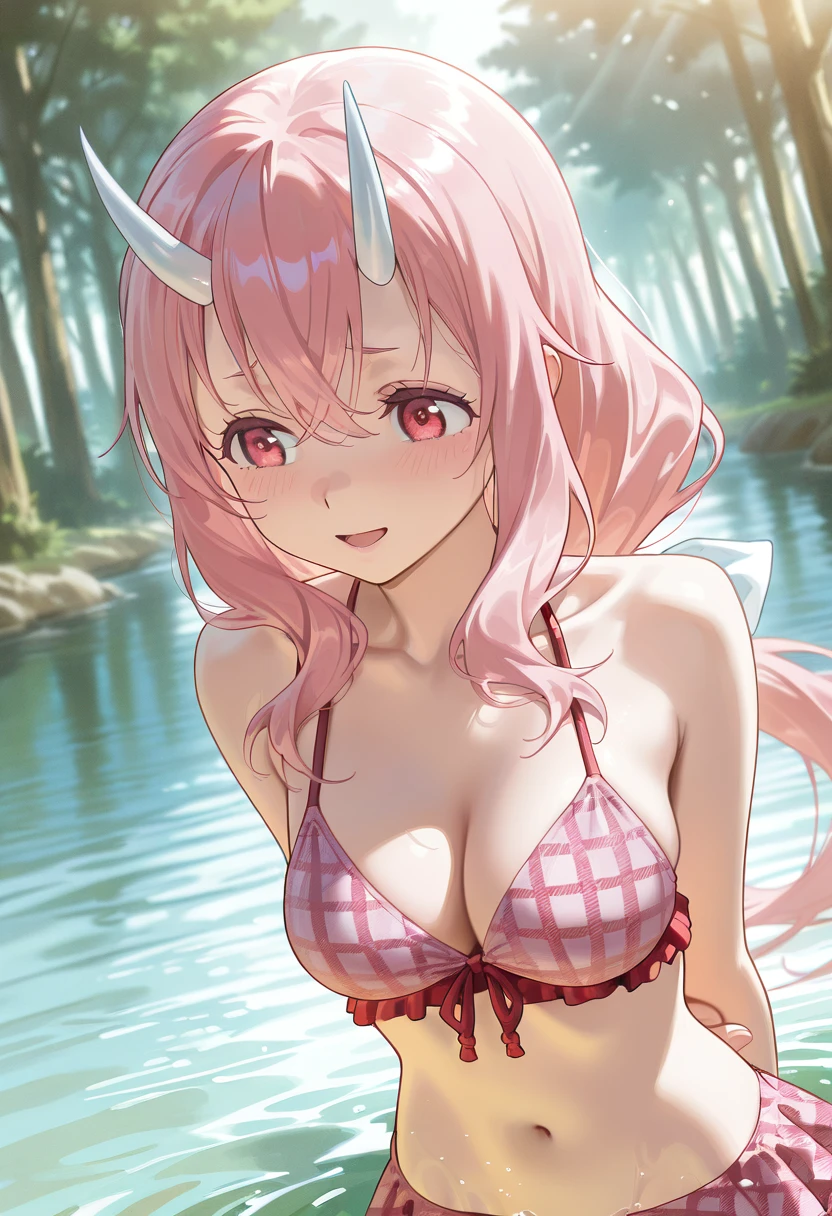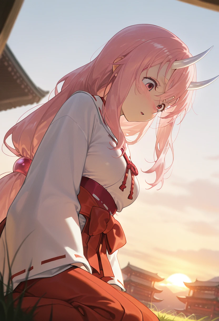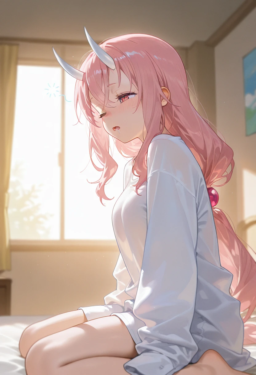 Tags for her look: 1girl, solo, long hair, medium breasts, red eyes, hair between eyes, very long hair, pink hair, pink eyes, crossed bangs, low-tied long hair, oni, white horns,