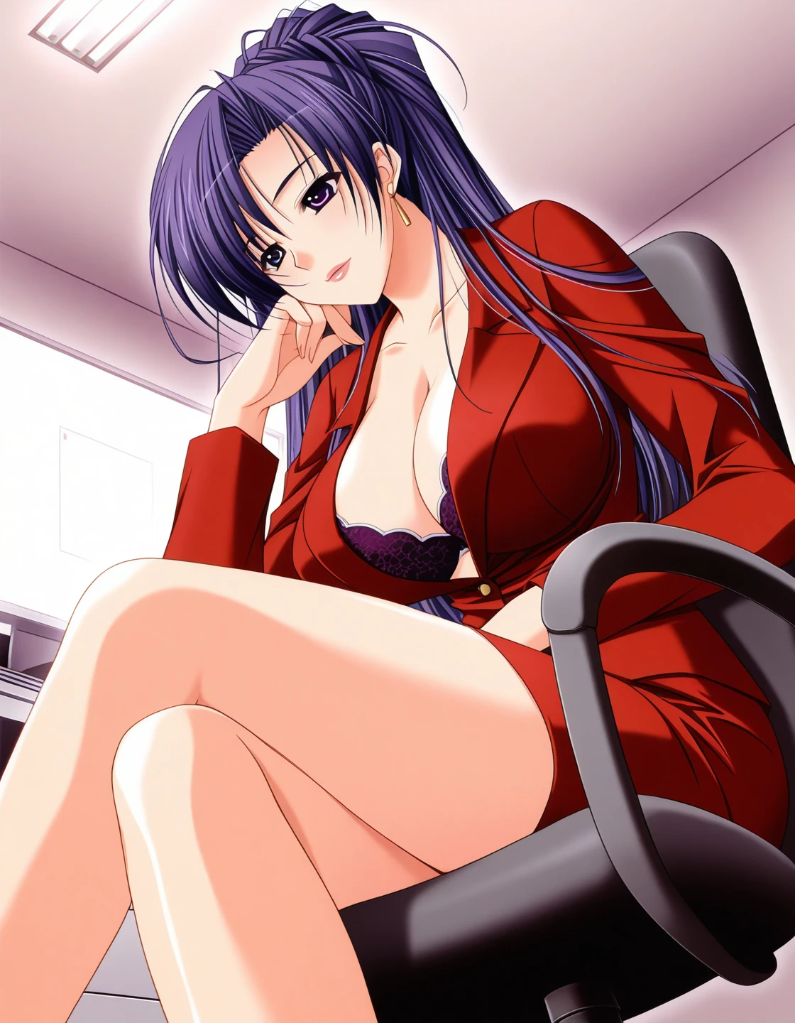 formal, red suit, cleavage, purple bra, lace-trimmed bra, red skirt