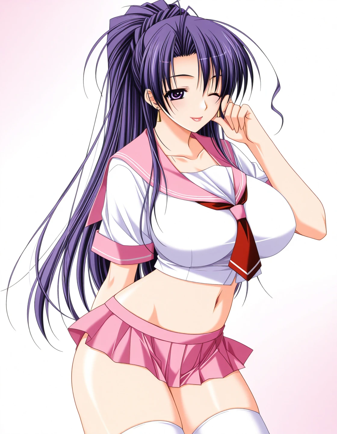 sumeragi sayaka, purple hair, ponytail, purple eyes, gold earrings, lips, mature femaleOutfit :