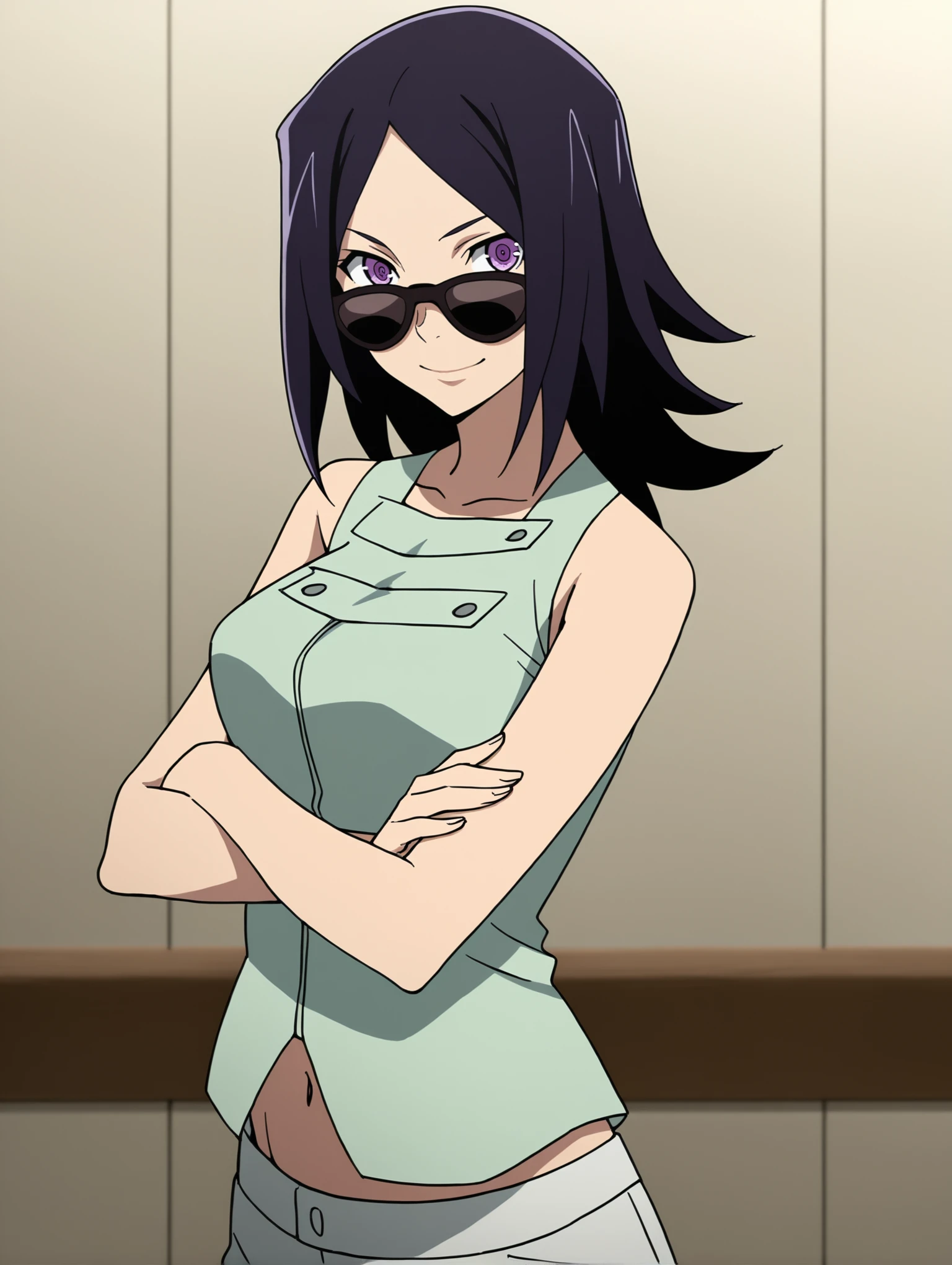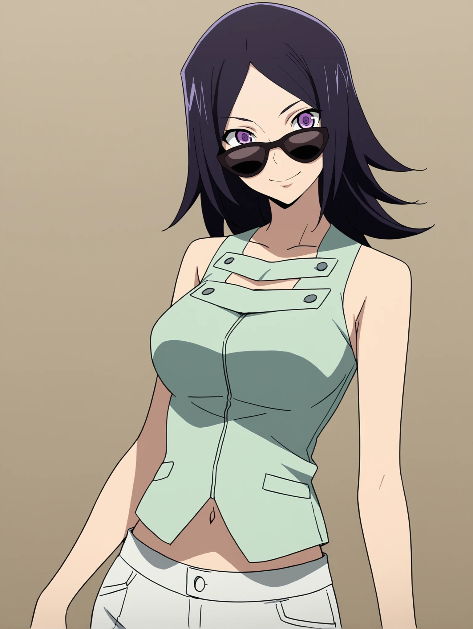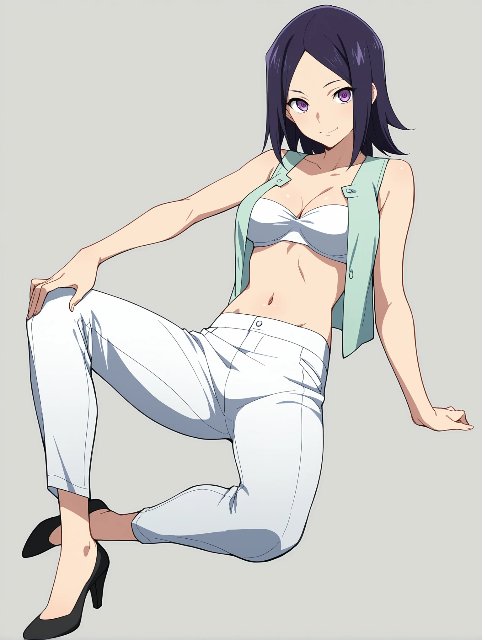 green vest,sleeveless,midriff peek,navel,white pants,black shoes,high heels