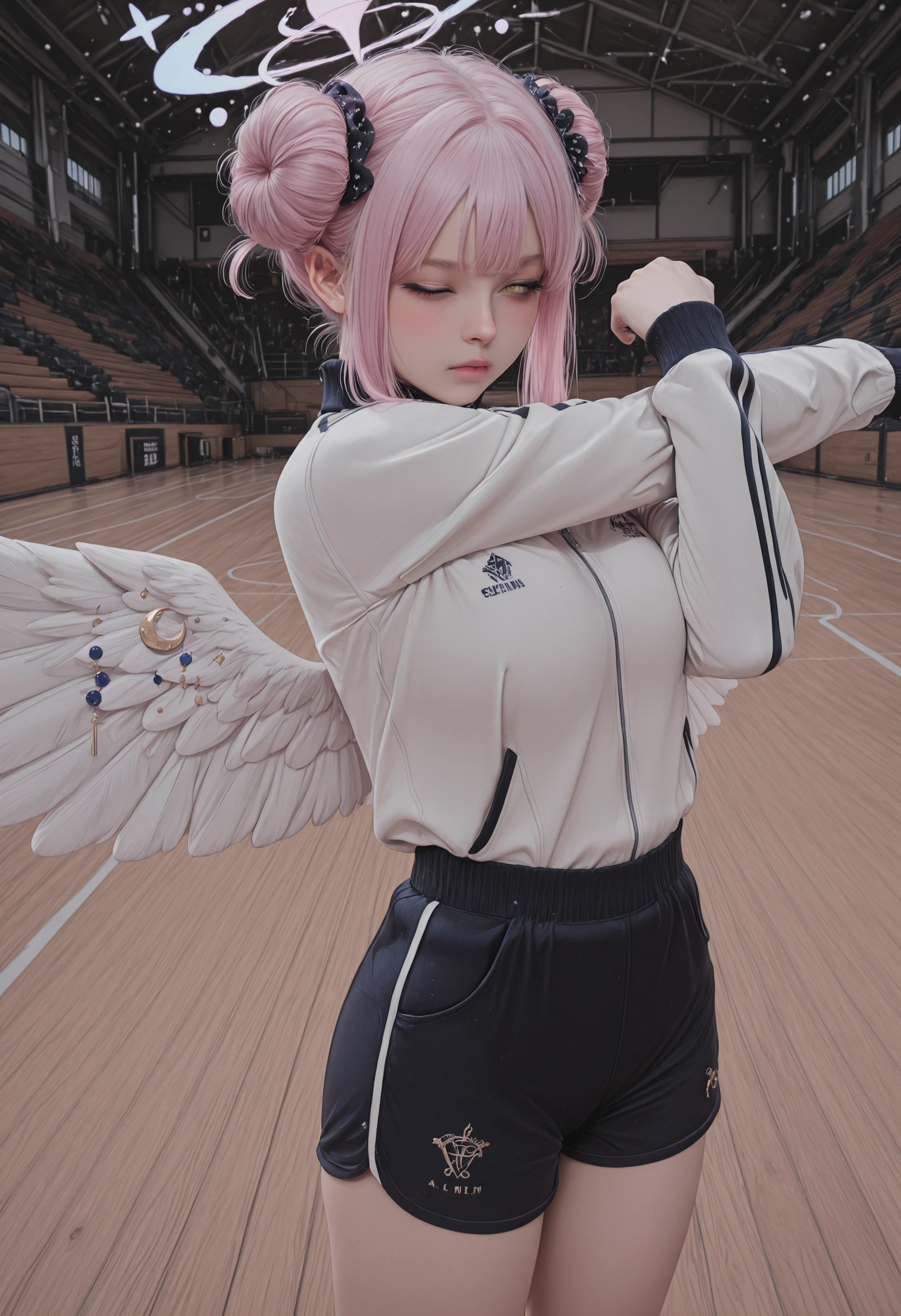 Gym Clothes trigger: shoes, jacket, sneakers, track jacket, shorts, scrunchie, double bun, long sleeves, sidelocks, bare legs, alternate costume