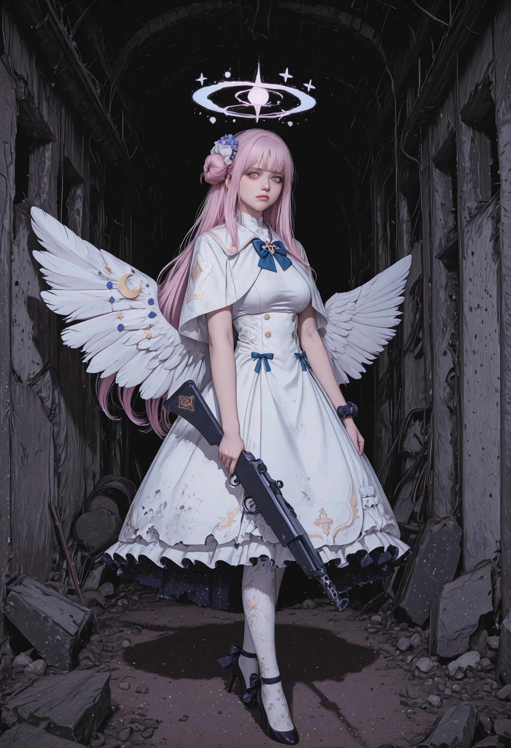 Trigger: 1girl, solo, long pink hair, single side hair bun, bangs, hair ornament, hair flower, yellow eyes, wings, halo