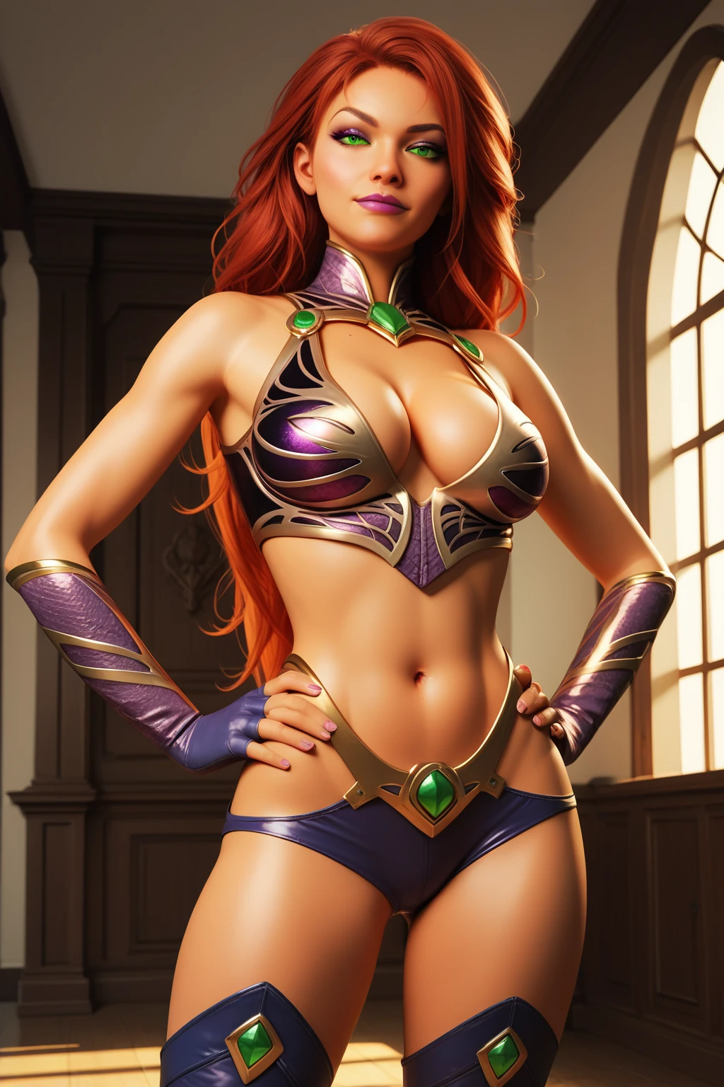 Hero Costume: armor, armor bikini, armor, cleavage, midriff, navel, fingerless gloves, shorts, thigh boots
