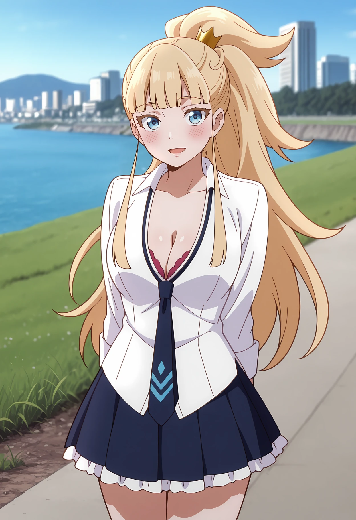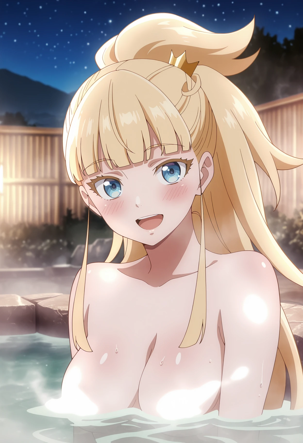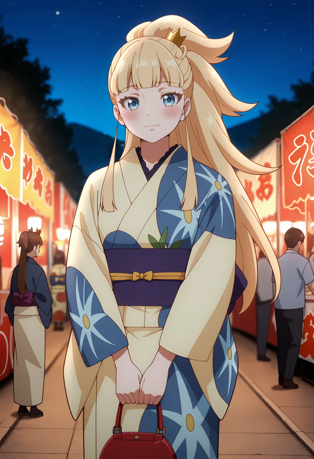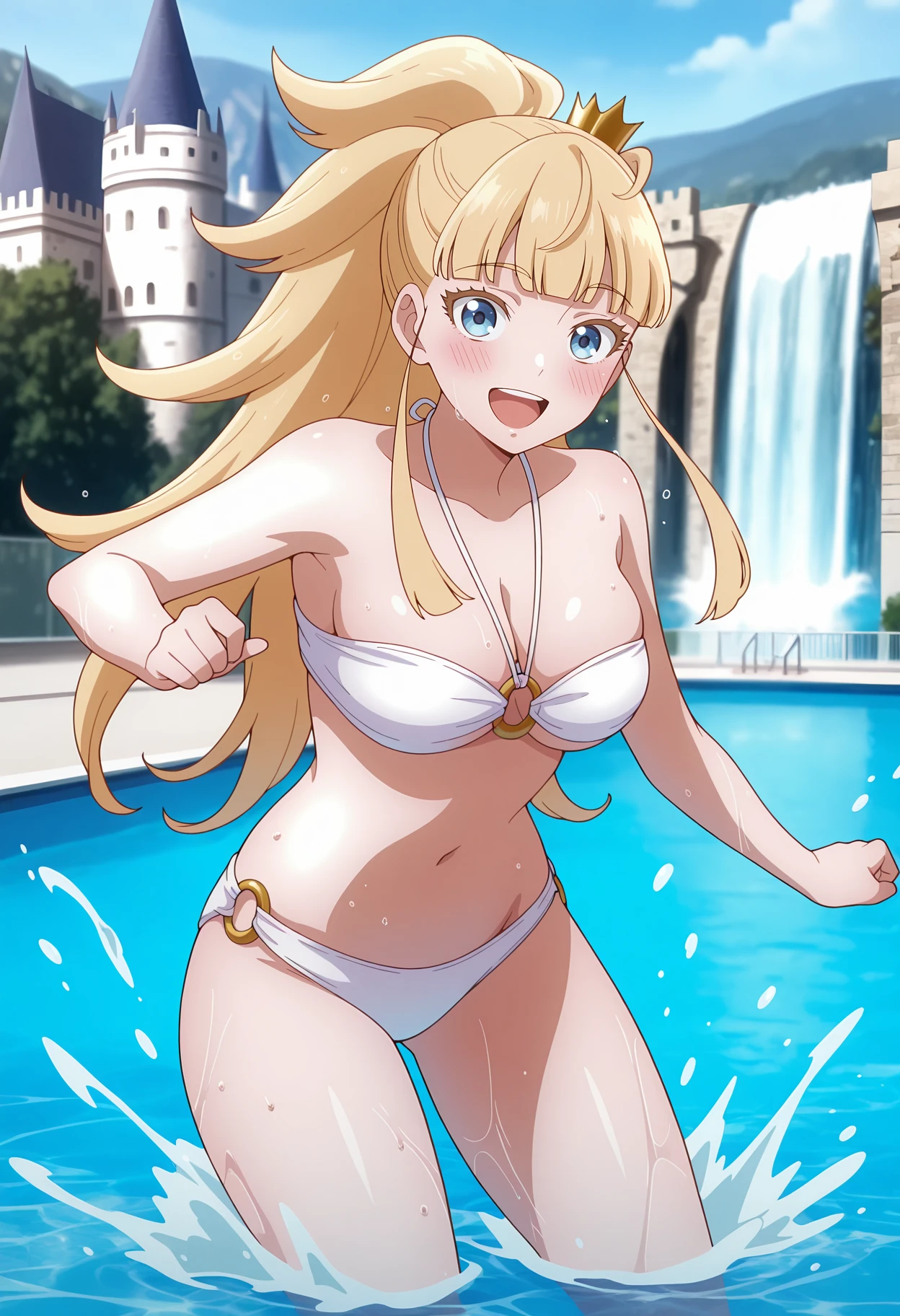 ponytail, long hair, blonde hair, blunt bangs, blue eyes, mini crown