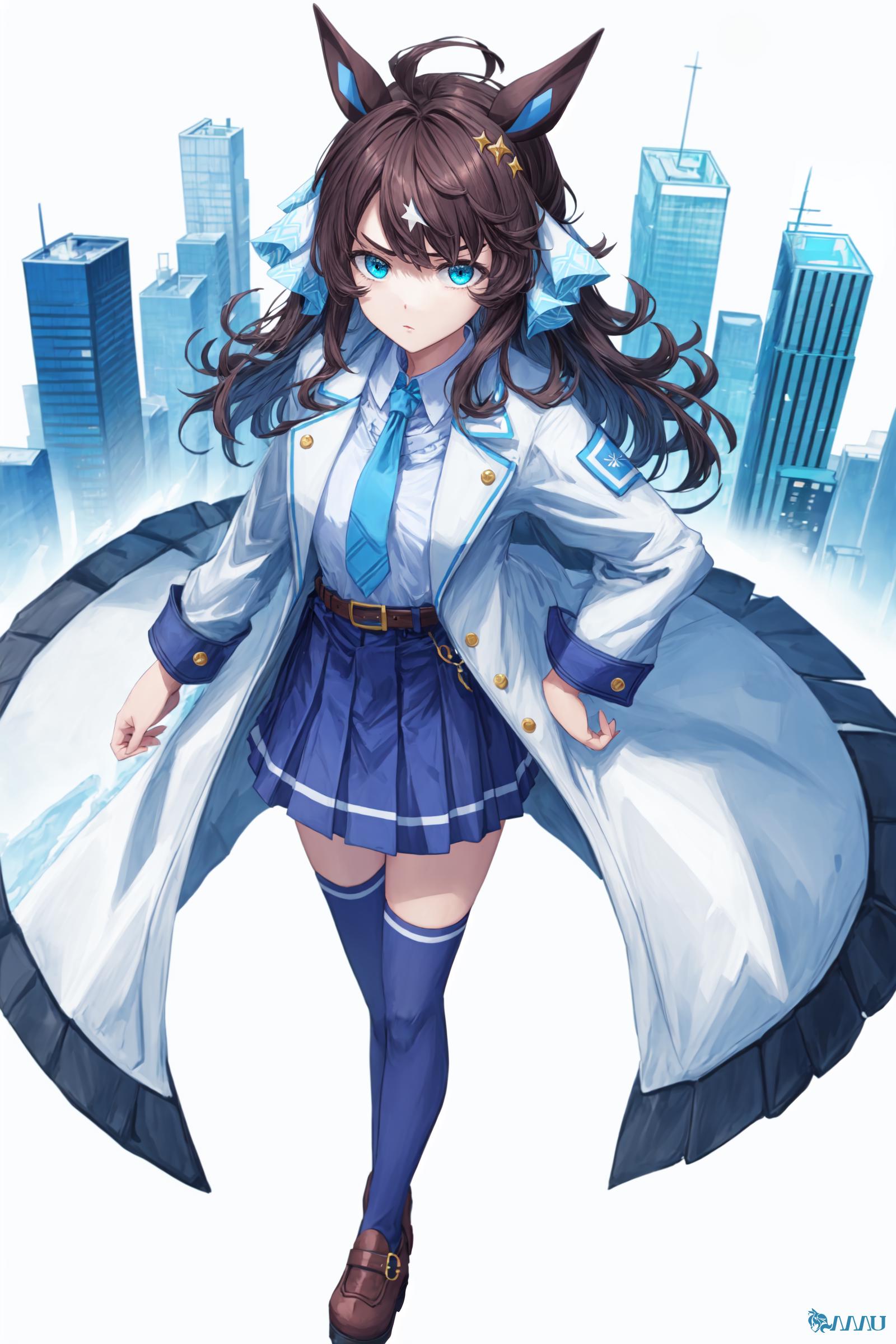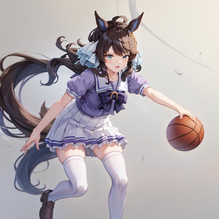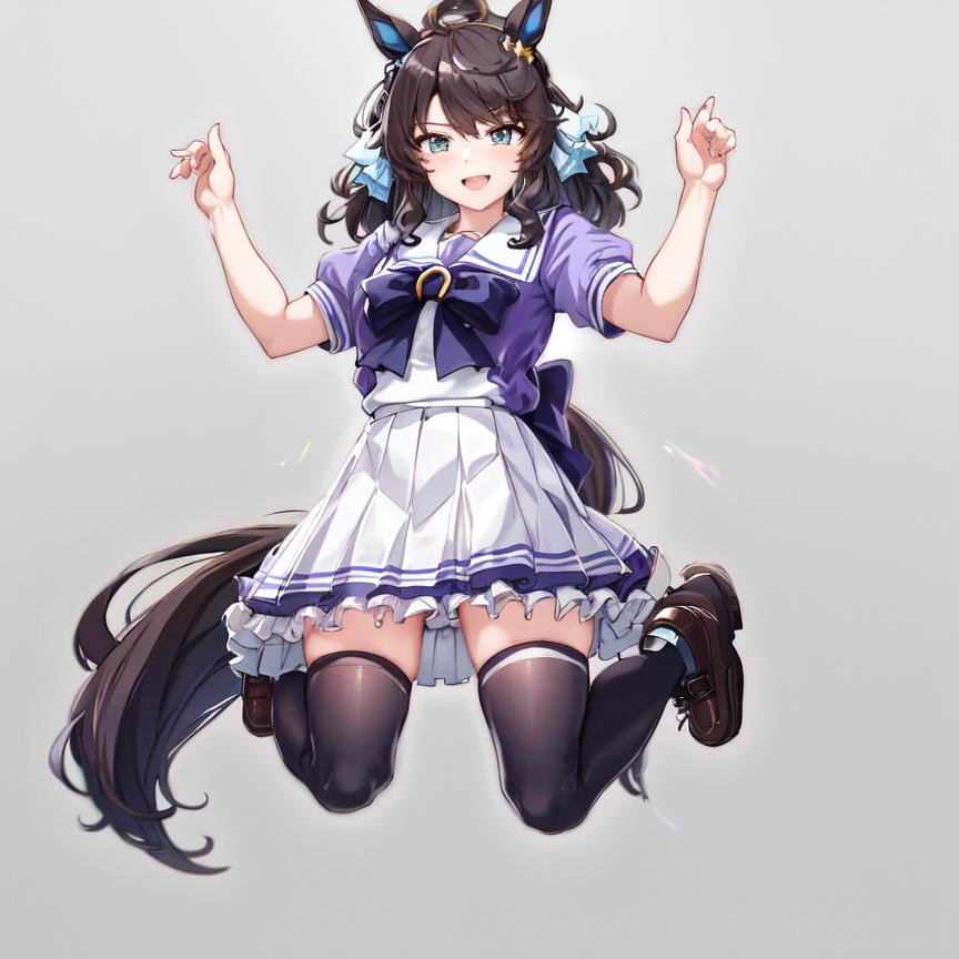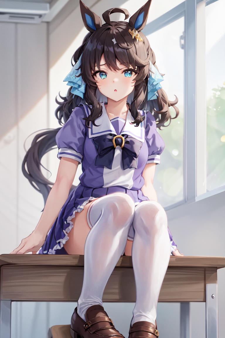 tracen school uniform, summer uniform, serafuku, puffy short sleeves, purple bowtie, horseshoe ornament, sailor collar, sailor shirt, purple shirt, white skirt, pleated skirt, frills, miniskirt, zettai ryouiki, white thighhighs, brown footwear, loafers