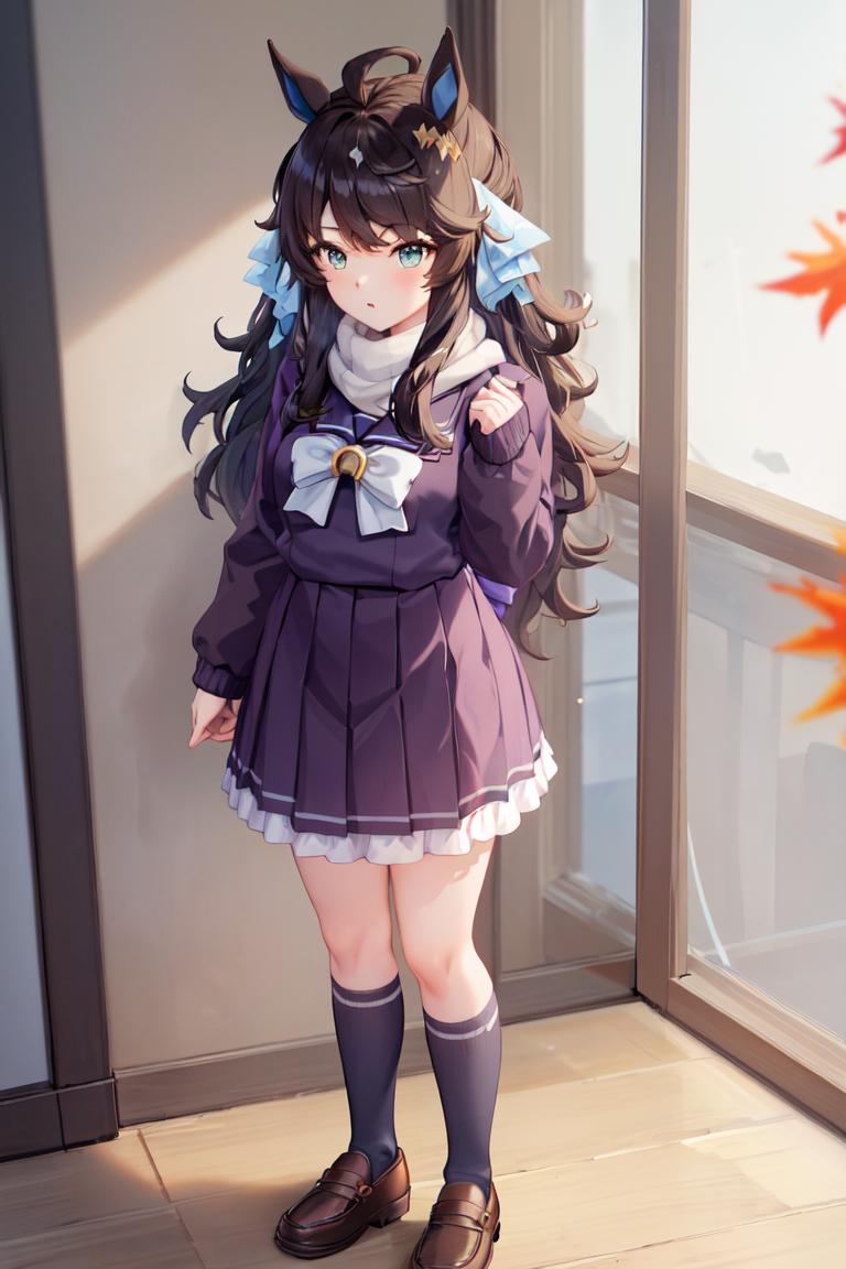 tracen school uniform, winter uniform, puffy long sleeves, sailor collar, purple shirt, white bowtie, horseshoe ornament, purple skirt, pleated skirt, brown footwear, loafers
