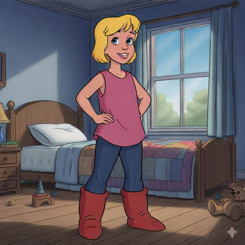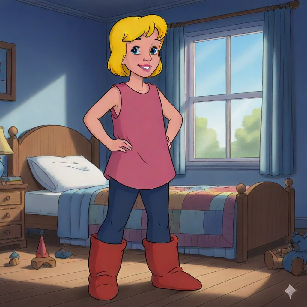 Robyn Starling, 1girl, solo shot, fair skin, blue eyes, blonde short hair, pink lips, standing, smile, arms at aside, full body shot, pink sleeveless loose tunic, Navy blue pants, red oversized soft boots, indoors, bedroom, bed, window, daytime, image generate