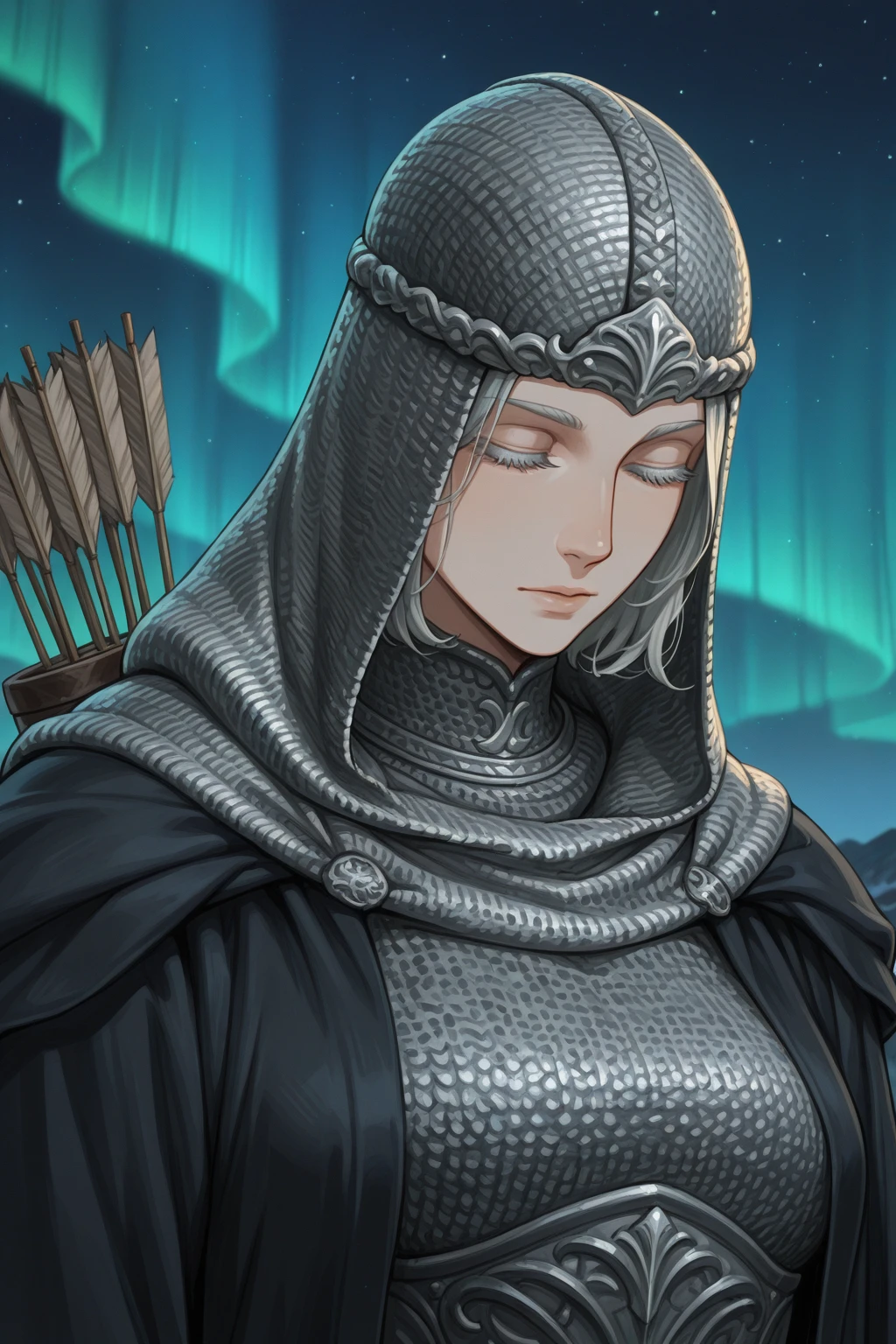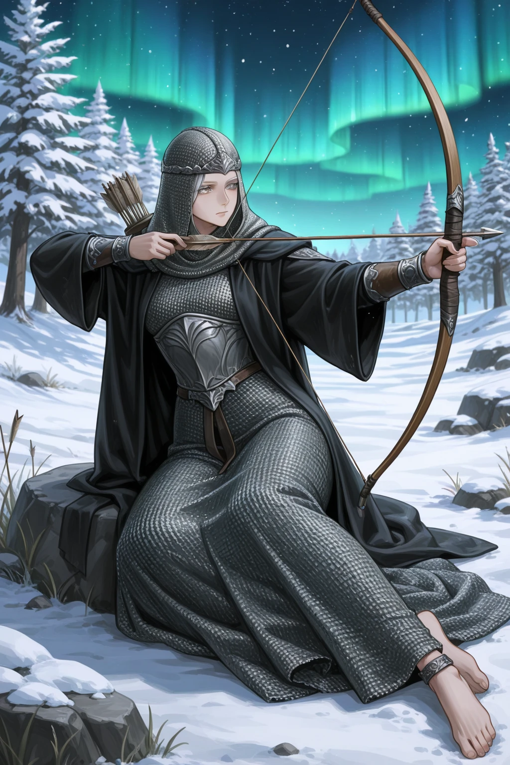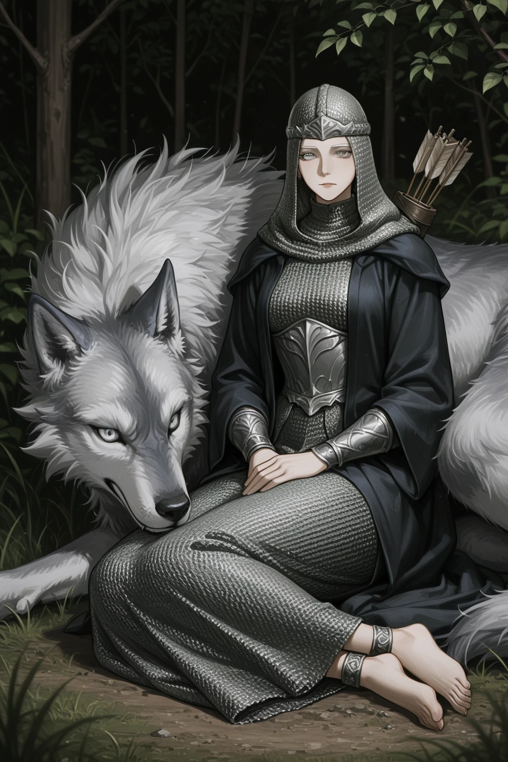 armor, chainmail, coif, chainmail coif, chainmail hood, chainmail skirt, hood up, circlet, quiver, robe, bracers, anklet, sitting, yokozuwari, short hair, grey hair, grey eyes, colored eyelashes, barefoot, toes,
