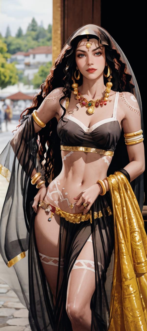 arabian clothes,, tribal,jewelry,bracelet,earrings,dress,armlet,bodypaint,navel,see-through,veil,sari,gold,chain,belly chain, Embroidery, This is a versatile LoRA model experiment with different weights for best results