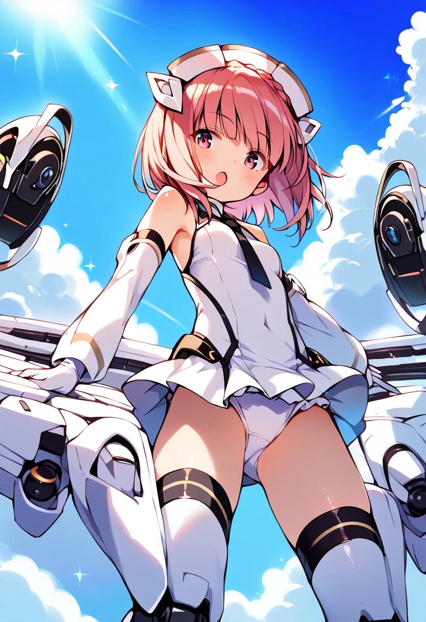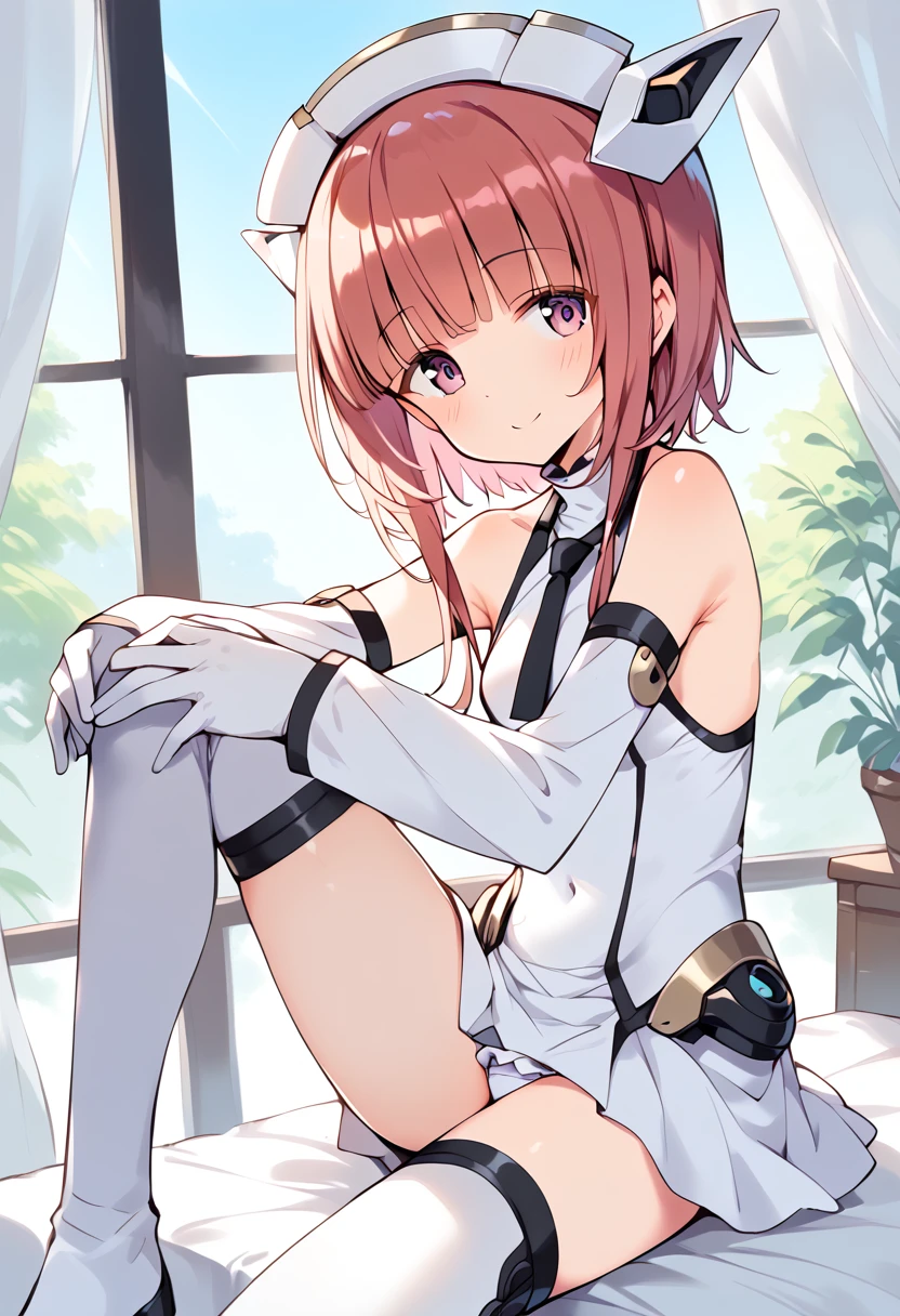 aikawa aika, white merry, normal gear, alice gear, french braid, crown braid, blunt bangs, short hair, red hair, pink hair, sidelocks, bob cut, eyebrows visible through hair, purple eyes, white leotard, frilled leotard, white skirt, showgirl skirt, detached sleeves, sleeveless, elbow gloves, white gloves, white collar, black necktie, black neckwear, halterneck, white thighhighs, white legwear, headgear, armor, mecha musume, thigh boots, armored boots, white footwear, covered navel, bare shoulders